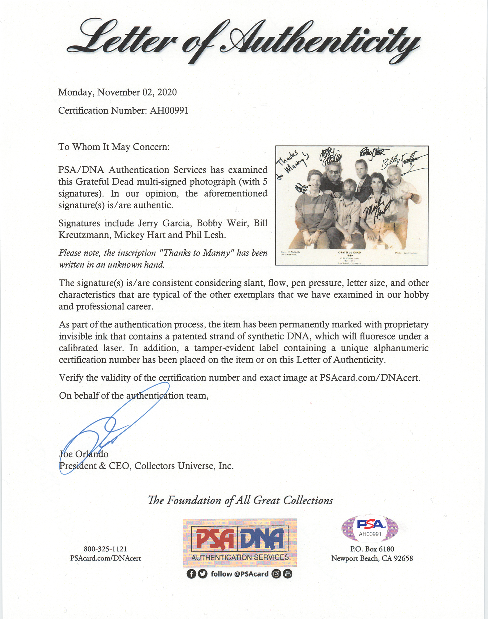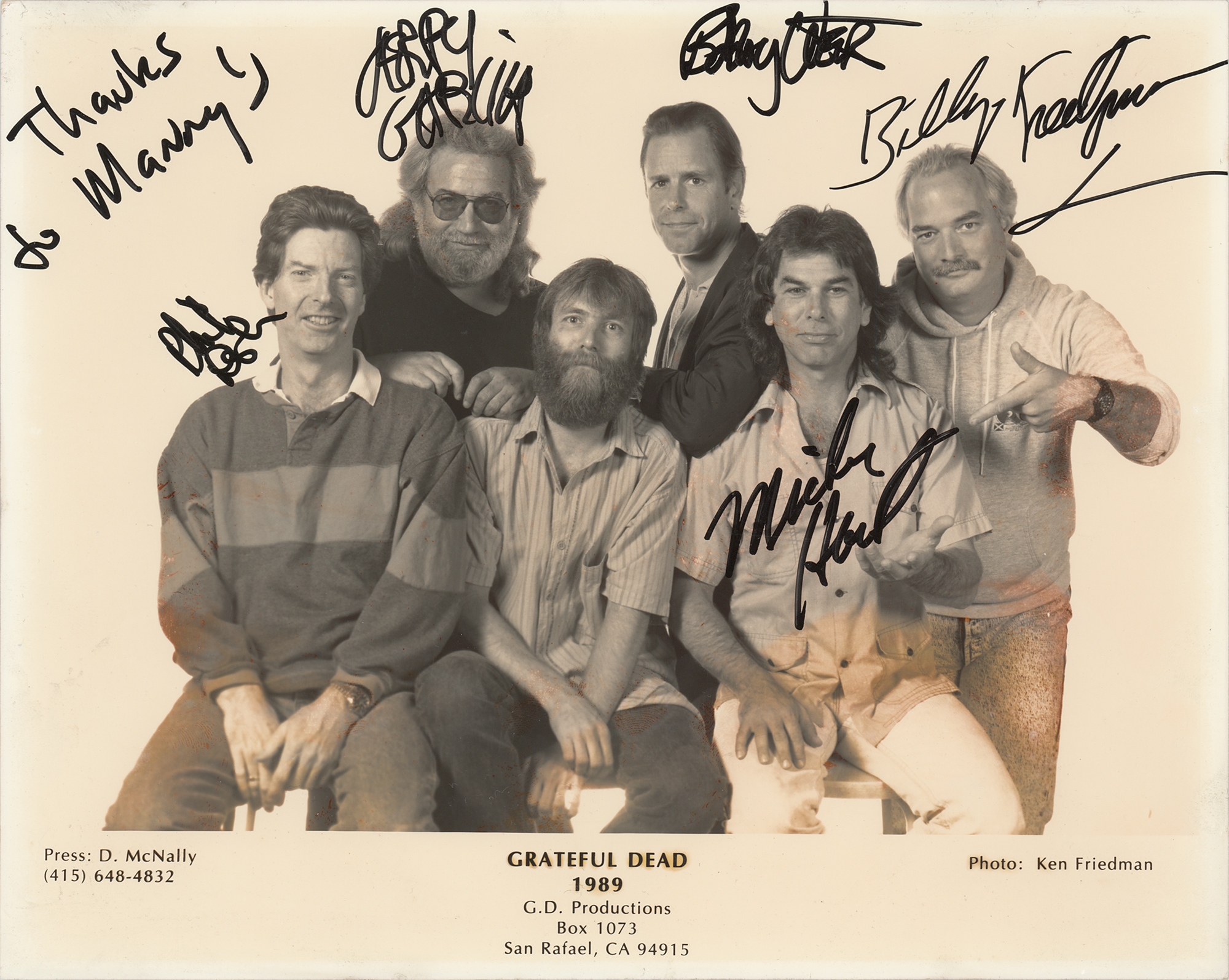 Glossy 10 x 7.75 publicity photo of the Grateful Dead circa 1989, signed in black felt tip, "Jerry Garcia," "Phil Lesh," "Bobby Weir," "Mickey Hart," and "Billy Kreutzmann," and inscribed in an unknown hand, "Thanks to Manny's." In very good to fine condition, with overall crazing and toning, and discoloration to the bottom of the image. Originally displayed amongst the hundreds of other signed photos at New York City's well-known Manny's Music Store—a popular shopping destination for huge touring acts like The Beatles, The Rolling Stones, Bob Dylan, and Jimi Hendrix, the latter granted private access to shop the store after closing hours—this appealing and crisply signed photo of the group's longtime core members has retained an impressive appearance. The majority of sold photos from Manny's bear significant water damage from the two occasions in which the store's sprinklers were set off; an uncommonly preserved example, this photo is made all the more desirable by its landmark inscription. Accompanied by a full letter of authenticity from PSA/DNA.