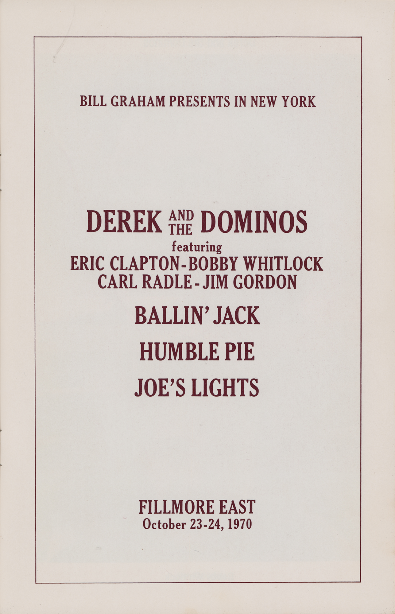 Concert program for Derek and the Dominos at the Fillmore East on October 23-24, 1970, 5.5 x 8.5, featuring many advertisements from that period of time for acts like Dave Mason and Cass Elliot, and Lee Michaels, and for the Andy Warhol movie Trash. Also includes a “Bill Graham Presents in New York” schedule for October and November that lists Albert King, Small Faces, Black Sabbath, Frank Zappa, Traffic, and Elton John. Also scheduled to perform on the bill are Ballin’ Jack and Humble Pie. In fine condition. These historic Fillmore East concerts were recorded and released to much acclaim in 1973 as a live double album entitled In Concert.