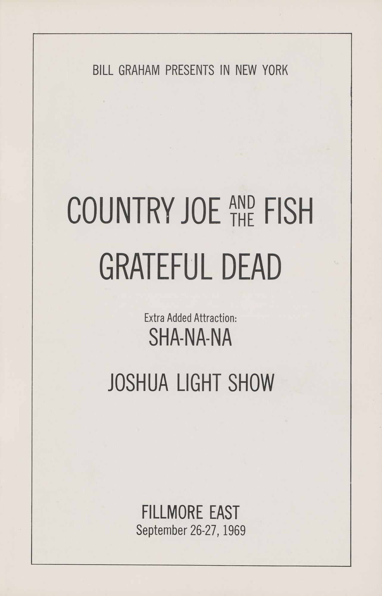Concert program for a Grateful Dead concert at the Fillmore East, New York, on September 26-27, 1969, 5.5 x 8.5, which lists Country Joe as the headliner and Sha-Na-Na as support. Iron Butterfly and Porter’s Popular Preachers as the other performing acts. The program features images and short biographies of the bands and is like a time capsule of the 1960s, filled with numerous period advertisements. Also includes a “Bill Graham Presents in New York” schedule for October that lists The Who, The Kinks, Vanilla Fudge, Chuck Berry, anf John Mayall. In fine condition.