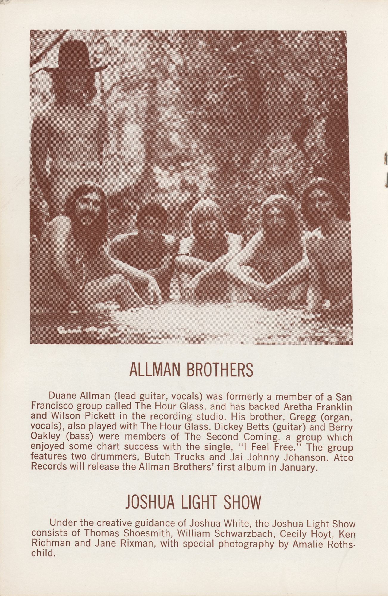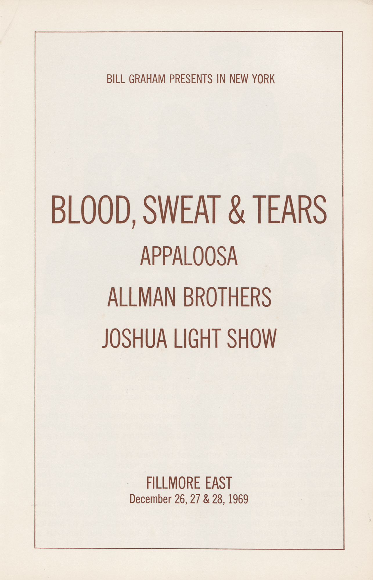 Scarce Fillmore East concert program, 5.5 x 8.5, 24 pages, promoting the Allman Brothers Band's first appearance at the legendary New York City venue on December 26-28, 1969, listing them as an opening act for Blood, Sweat & Tears, along with Appaloosa. The program features short biographies of the bands and is like a time capsule of the 1960s, filled with numerous period advertisements including an Atco Records ad for The Allman Brothers' debut release. In very good to fine condition, with light handling wear, and staining to the back cover.