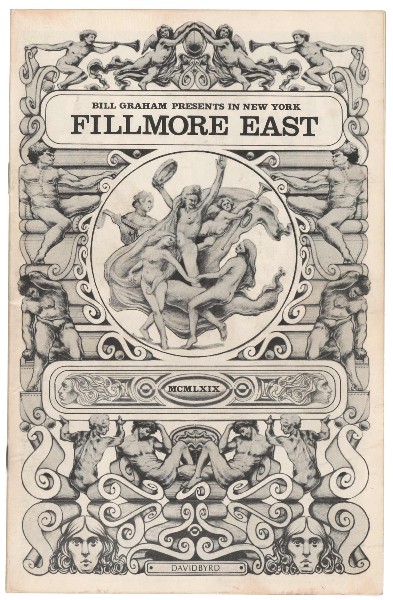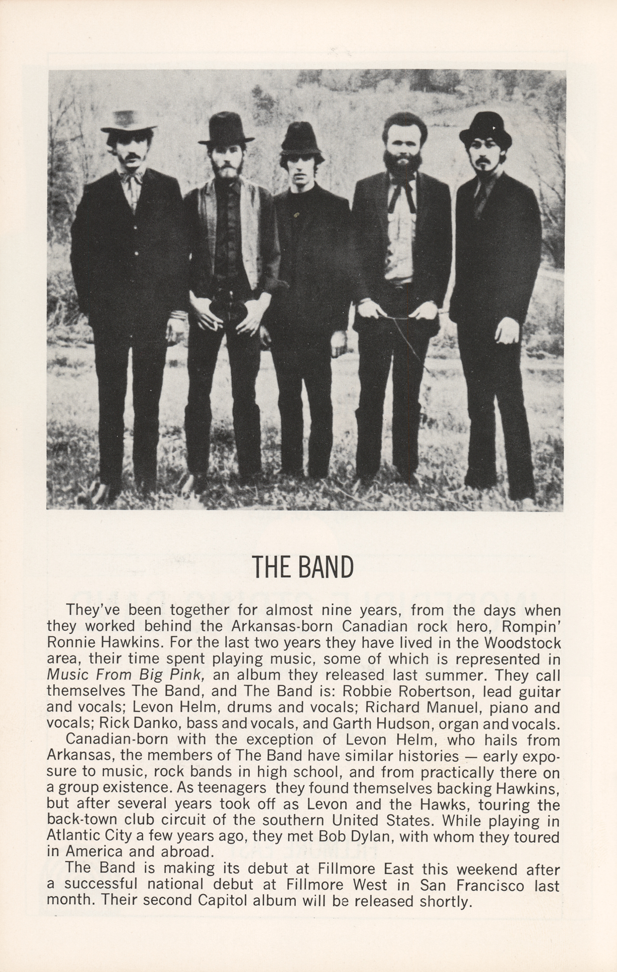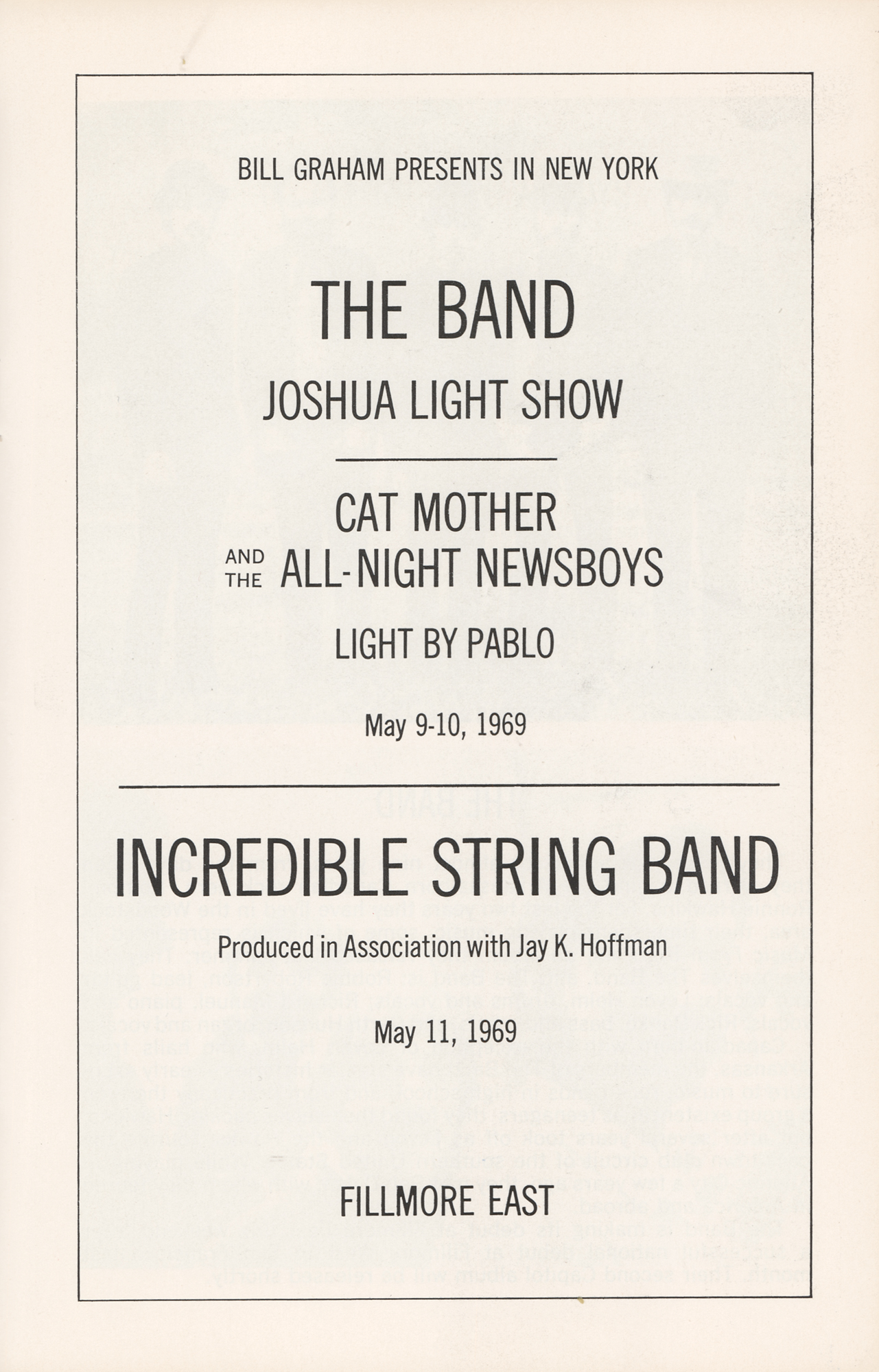 Concert program for The Band at the Fillmore East on May 9-10, 1969, and the Incredible String Band on May 11, 1969, measuring 5.5 x 8.5 and featuring vintage advertisements for releases by The Who, Johnny Winter, Joe Cocker, and The Grateful Dead. Cat Mother and the All-Night Newsboys are slated to perform with The Band. A “Bill Graham Presents in New York” schedule for May and June lists The Who on May 16 and 17 (when Townshend is arrested for kicking a cop), Sly and the Family Stone on May 23 and 24, and Led Zeppelin on May 30 and 31. In fine condition, with light handling wear.