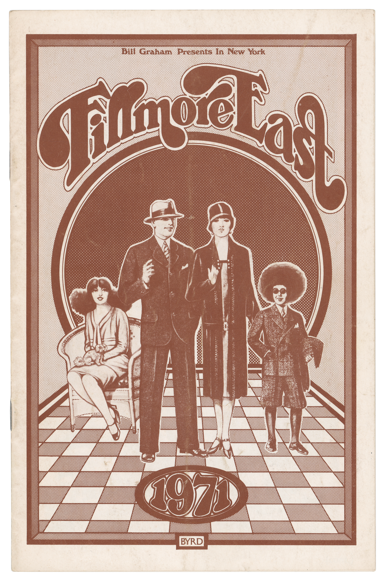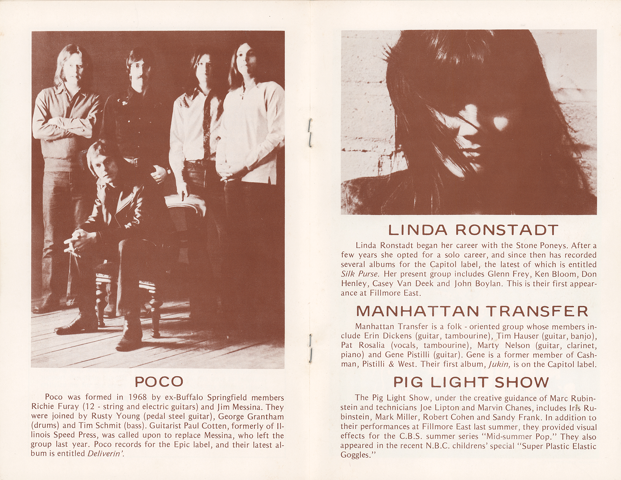 Fillmore East program for a pair of Linda Ronstadt concerts on May 7-8, 1971, eight pages, 5.5 x 8.5, with shows also promoting performances by Poco and Manhattan Transfer. Rondstadt’s band featured future Eagles members Glenn Frey and Don Henley, and ironically Poco featured future Eagles bassist Timothy B. Schmit. The program features short bios and photos of the bands, as well as a few classic ads from the period. In fine condition, with a light central vertical fold.