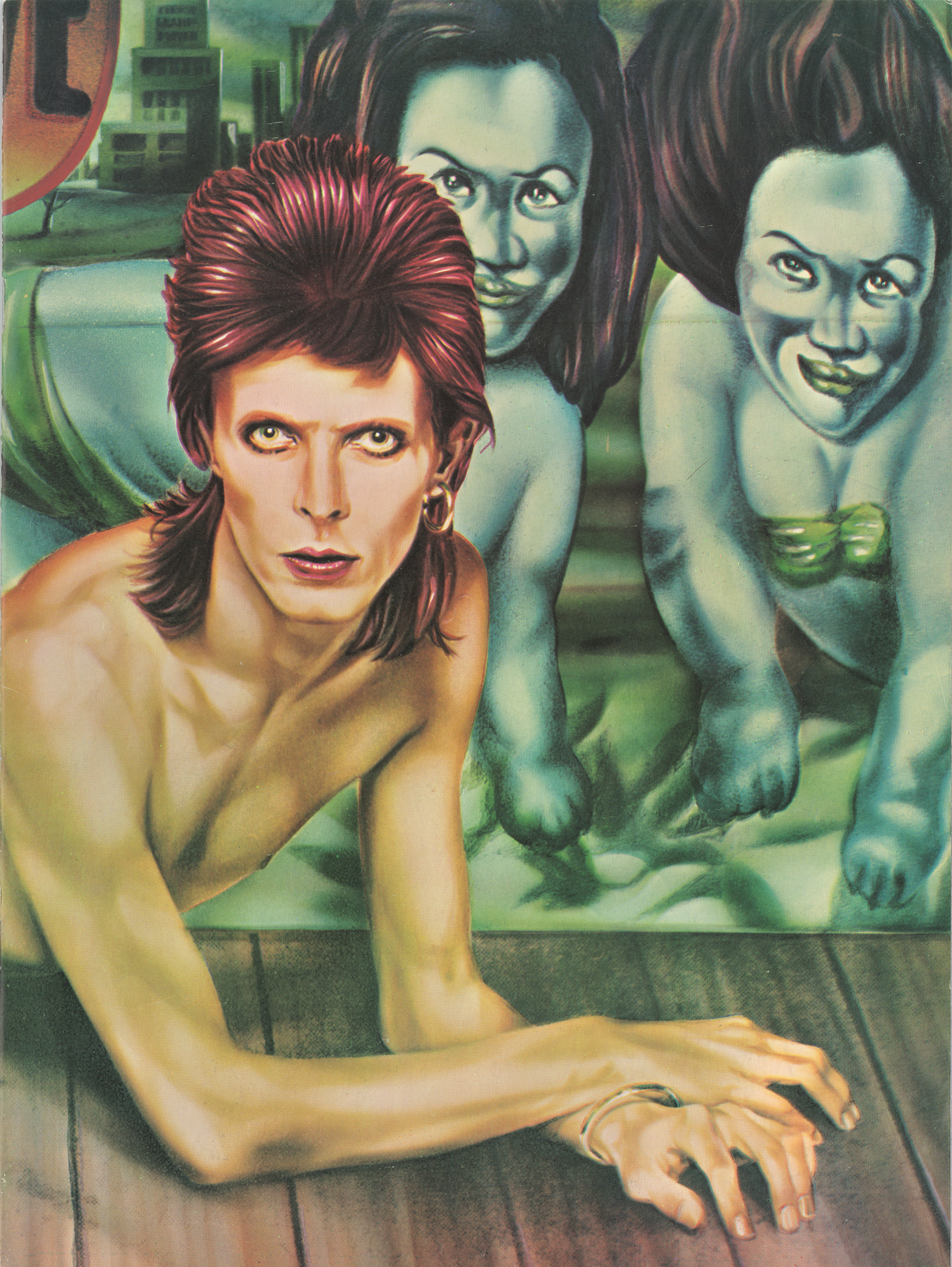 Original satin-finish tour program from David Bowie's 1974 Diamond Dogs Tour, 9 x 12, 20 pages, featuring several full-page images of the artist inside as well as the setlist, which was only in the first edition programs. The full bleed color cover features the album artwork designed by Guy Peellaert, showing Bowie as a grotesque man-dog hybrid. In very fine condition.