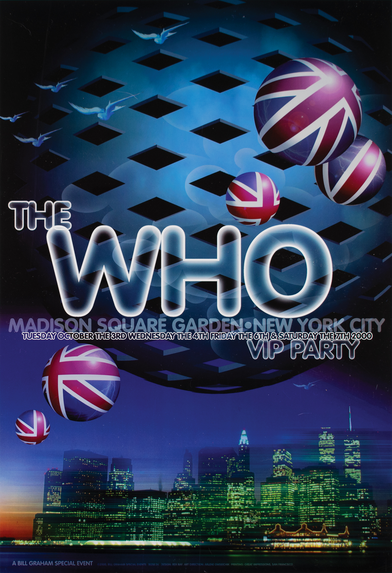 Original first printing color 13 x 19 concert poster designed by graphic artist Rex Ray for The Who’s third leg of their 2000 tour ending with 4 nights at Madison Square Garden in New York City on October 3-4th and 6-7th, presented by Bill Graham. The poster features an image of the New York City skyline at the time, which sadly wouldn’t be the same less than a year later. In Near Mint condition.