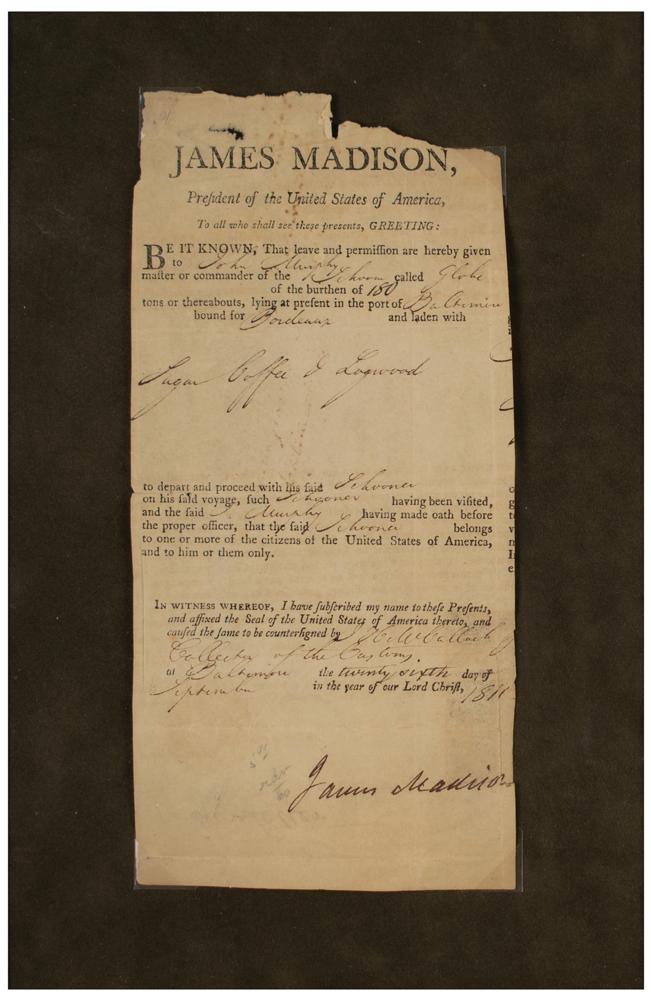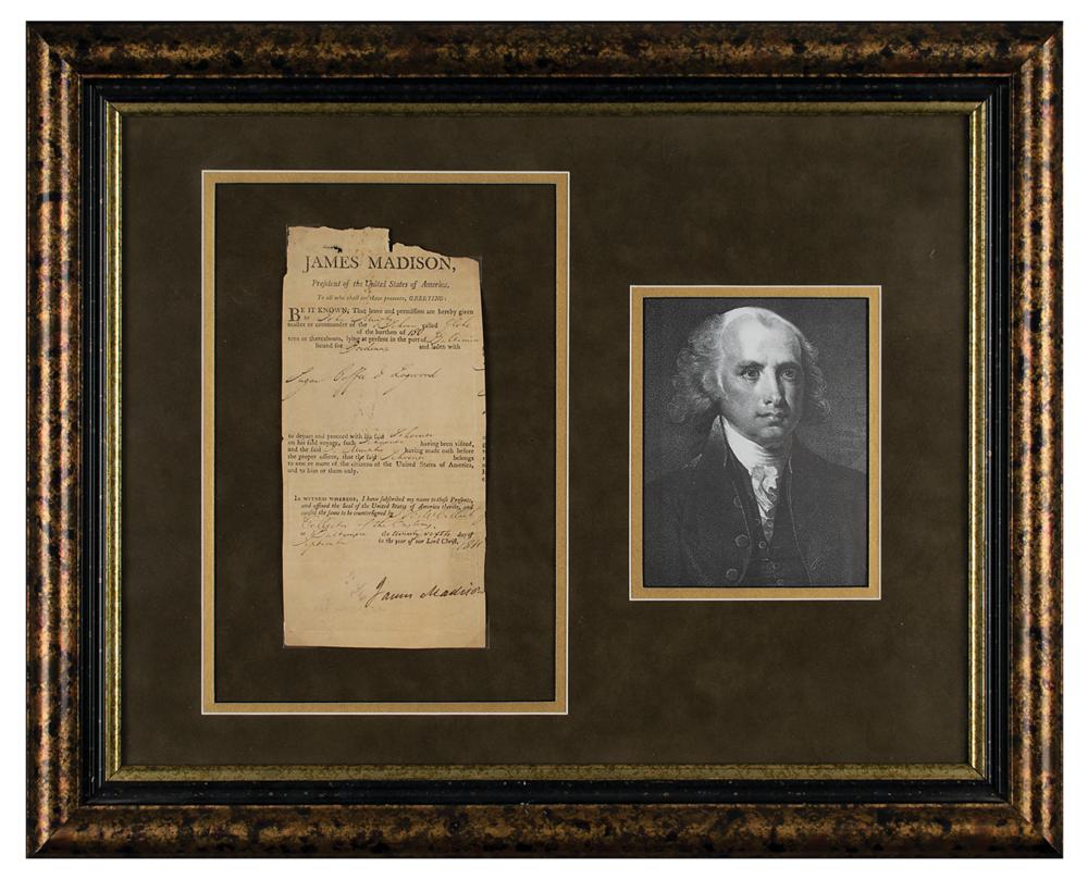 Partly-printed DS as president, one page, 4.25 x 8.75, September 26, 1811. The English-language section of a four-language ship’s papers issued to “John Murphy, master or commander of the Schooner called Globe?lying at present in the port of Baltimore and bound for Bordeaux, and laden with Sugar, Coffee & Logwood." Signed boldly at the conclusion by President James Madison. Mounted, matted, and framed to an overall size of 21.25 x 17.5. In very good to fine condition, with intersecting folds, paper loss to the top, and a tiny edge tear just touching the last letter of the signature.