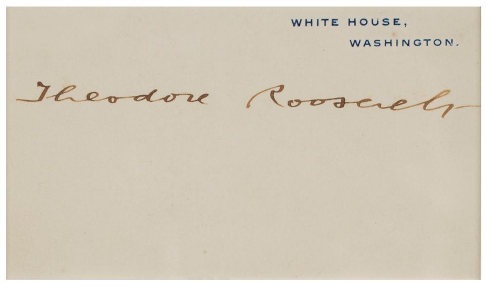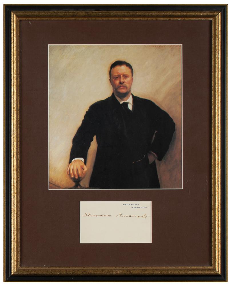 White House card, 4 x 2.25, signed neatly in fountain pen by Theodore Roosevelt. Matted and framed with a portrait to an overall size of 12.5 x 15.5. In fine condition.