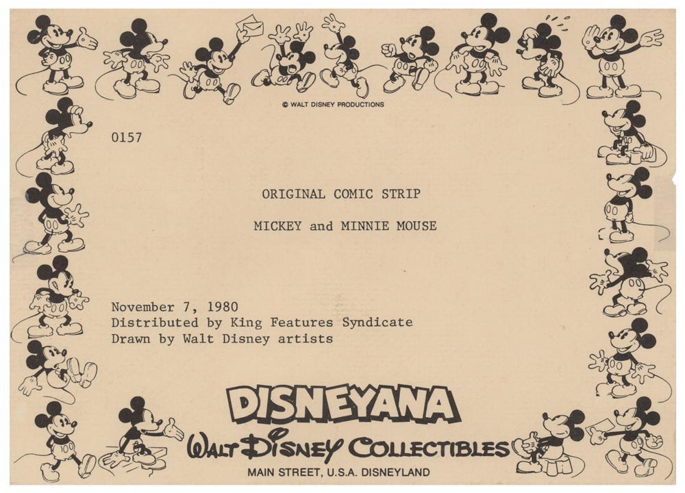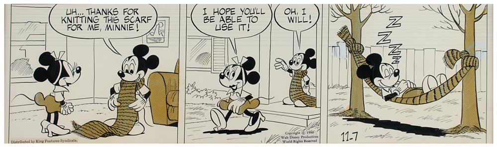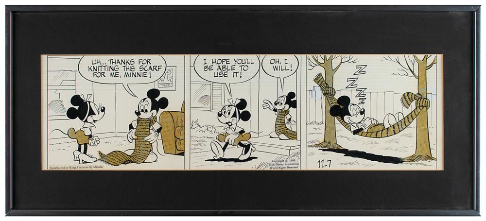 Original hand-inked three panel Mickey and Minnie Mouse daily comic strip drawn by Walt Disney artists for November 7, 1980. The comic strip, 19.5 x 5.5, accomplished in ink with instances of affixed cellophane, begins with Minnie presenting Mickey with a new winter present: “Uh?thanks for knitting this scarf for me, Minnie!” When Minnie leaves for the day, she says, “I hope you’ll be able to use it!,” to which Mickey replies, “Oh, I will!” The final scene shows Mickey sound asleep in the backyard, the oversized scarf being used as a hammock. The last panel is marked “11-7,” a King Features Syndicate label is affixed to the first panel, and a “1980 Walt Disney Productions” copyright notice is affixed to the second panel. Matted and framed to an overall size of 23.25 x 10.25. In fine condition. Accompanied by a certificate of authenticity from Disneyana.