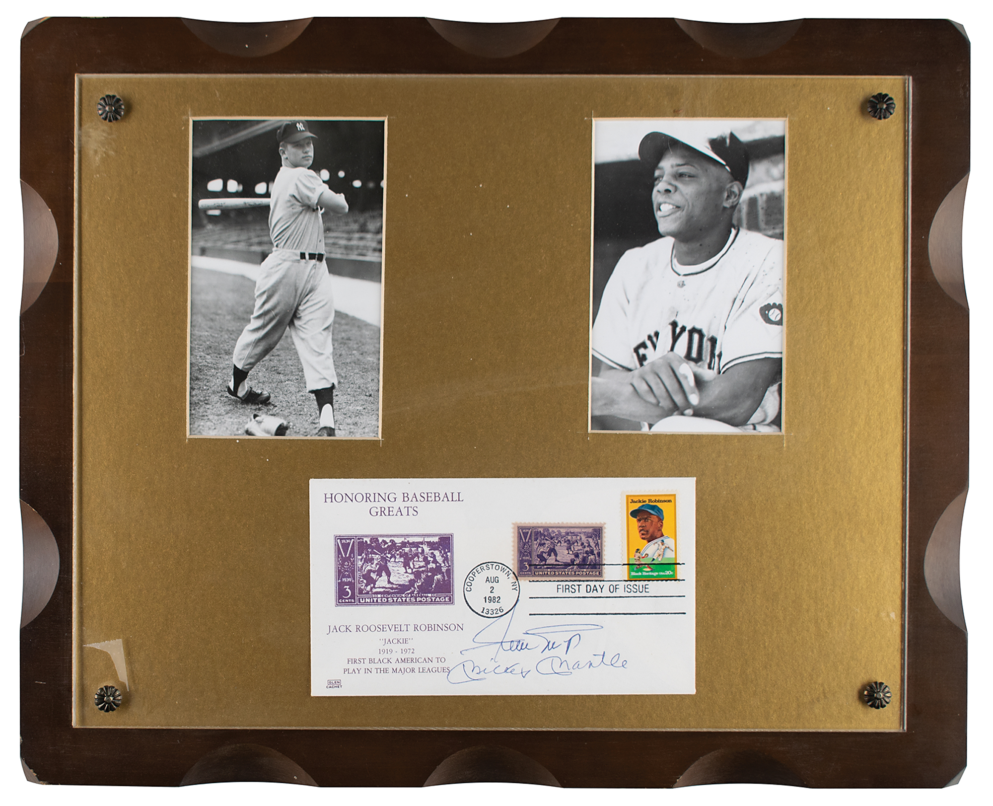 FDC with a cachet honoring baseball great Jackie Robinson, postmarked at Cooperstown, New York, on August 2, 1982, signed in blue ballpoint by Mickey Mantle and Willie Mays. Mounted and matted with images of the Hall of Fame ballplayers, and displayed under Plexiglas on a wooden 16 x 13 mount. In fine condition.