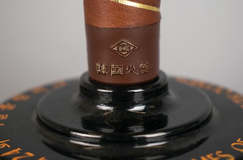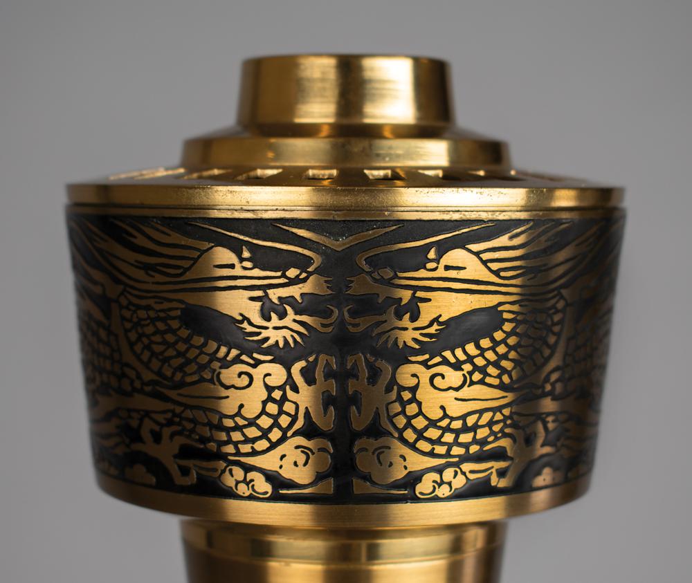 Beautifully designed official 1988 Seoul Olympics torch, constructed of metal, copper, leather, and plastic, measuring 20″ in length and 4″ at its widest point, designed by Lee Woo-Sung and manufactured by Korea Explosives Co. Ltd. The handle is wrapped in brown leather with a ring above, inscribed, "Games of the XXIVth Olympiad Seoul 1988," in English and Korean. The upper portion of the torch bears a colorful Olympic ring emblem and the top is engraved with an intricate dragon design symbolizing the harmony between East and West; based on the Chinese zodiac, the year 1988 was also the year of the dragon. Displayed upon its original bilingual (Korean/English) presentation stand, and accompanied by a Korean plaque (translated): "This torch was used in the 24th (88.9.7-88.10.21) Olympics."