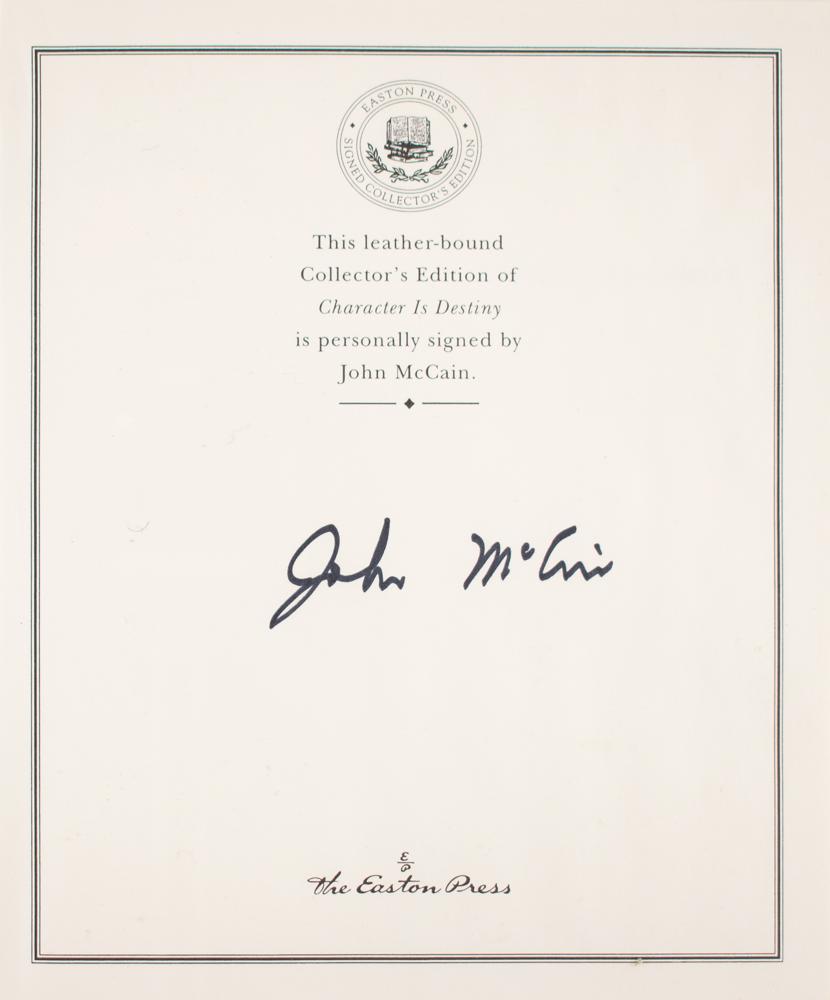 Signed book: Character Is Destiny. Collector's edition. Norwalk, CT: Easton Press, 2007. Leatherbound hardcover, 8.25 x 9.5, 311 pages. Signed on the colophon in black felt tip by John McCain. In very fine condition. Accompanied by the publisher's certificate of authenticity.