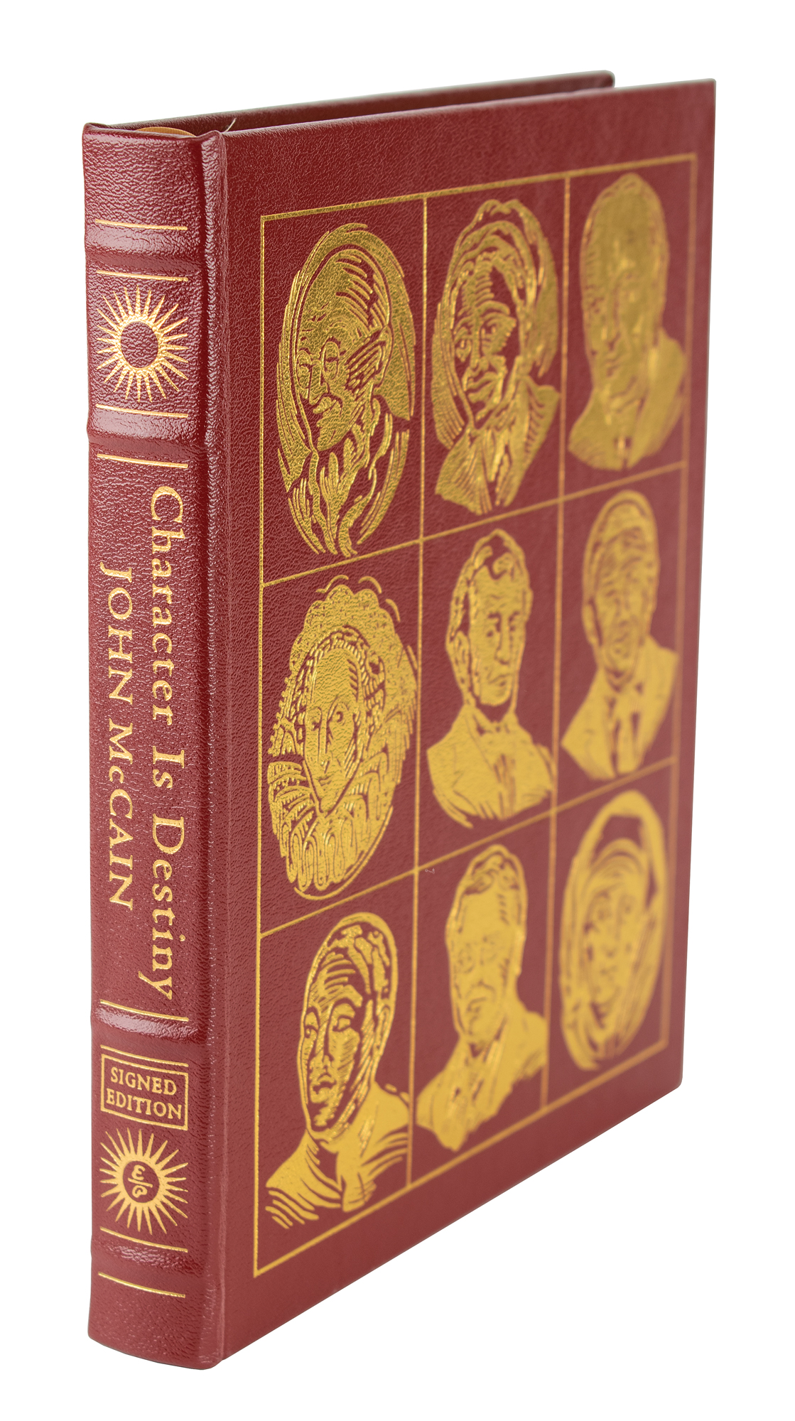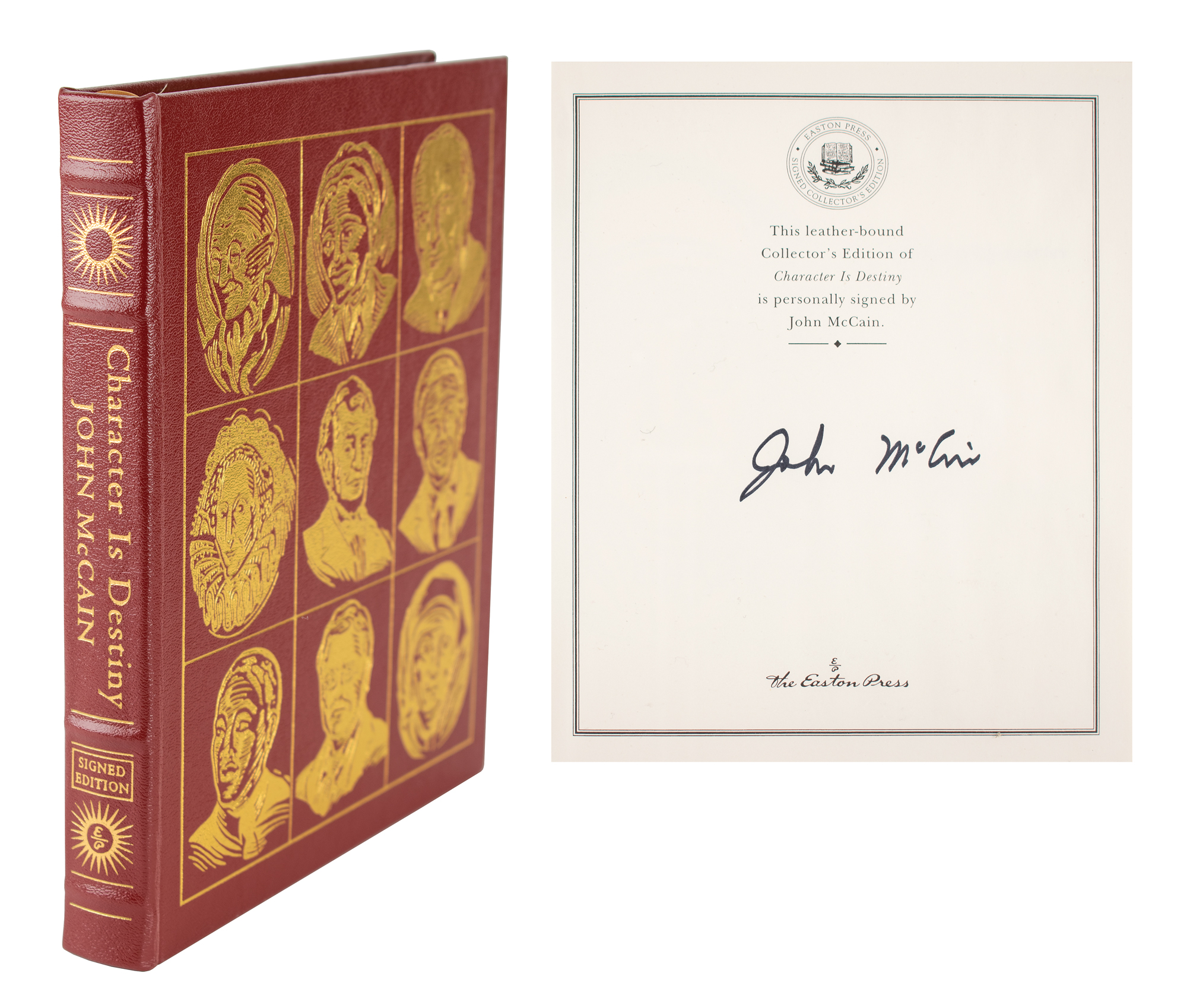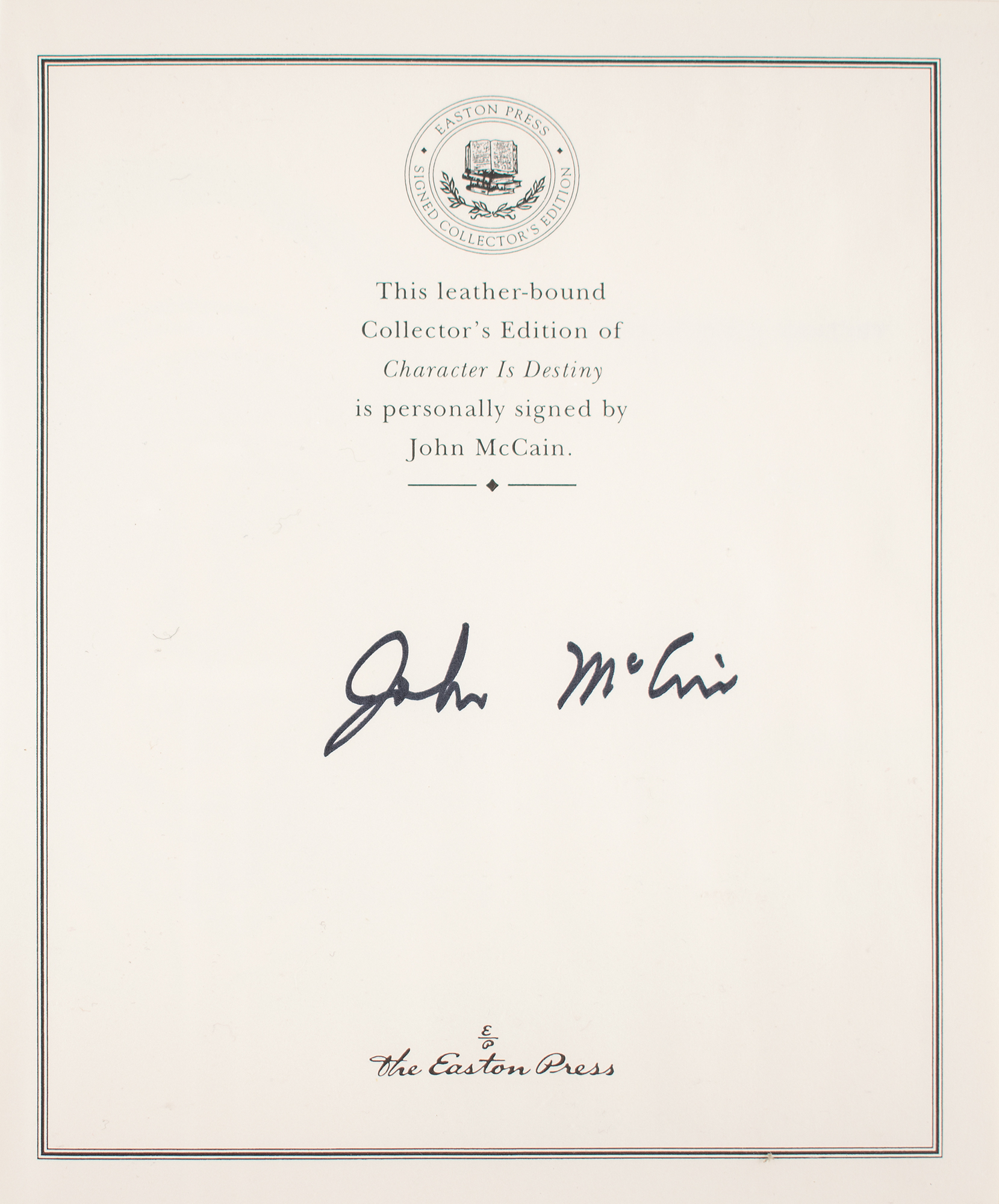 Signed book: Character Is Destiny. Collector's edition. Norwalk, CT: Easton Press, 2007. Leatherbound hardcover, 8.25 x 9.5, 311 pages. Signed on the colophon in black felt tip by John McCain. In very fine condition. Accompanied by the publisher's certificate of authenticity.