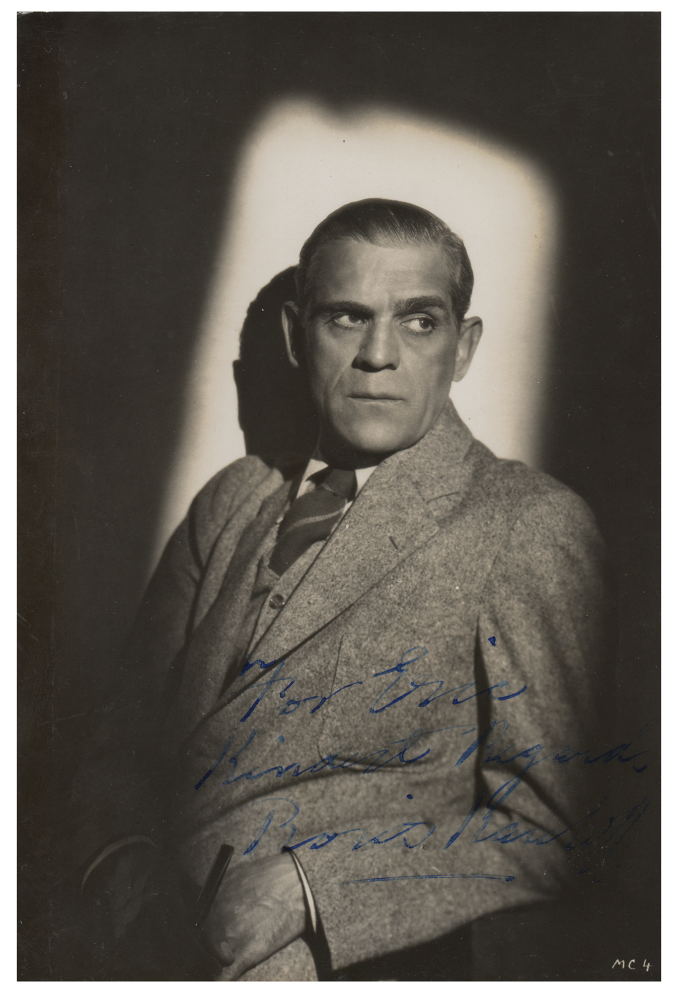 Vintage glossy 4.5 x 6.75 photo of Karloff under a spotlight, signed and inscribed in fountain pen, "For Eric, Kindest regards, Boris Karloff.” In fine condition, with some light silvering to the darker areas of the image, and mounting remnants to the reverse.