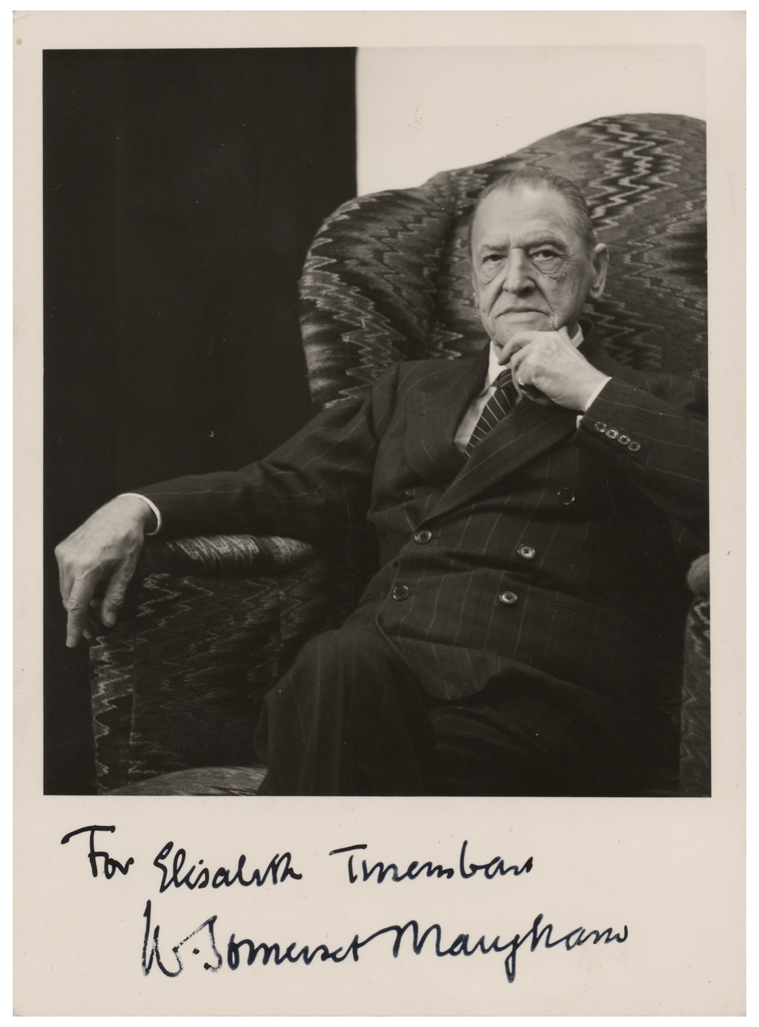 Vintage glossy 4.75 x 6.5 photo of the esteemed British novelist seated in a wingback chair, signed and inscribed in the lower border in fountain pen, "For Elisabeth? W. Somerset Maugham.” Reverse bears a Max Rayner credit stamp. In fine condition.
