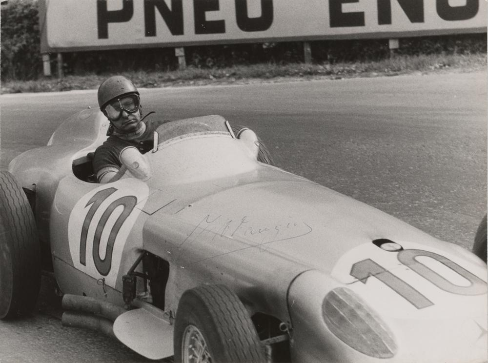Vintage glossy 9 x 6.5 photo of Fangio in his iconic Mercedes-Benz W196 race car, signed in black ballpoint, "J. M. Fangio." In fine condition, with the signature a shade light. Fangio is uncommon in signed photos of this size.