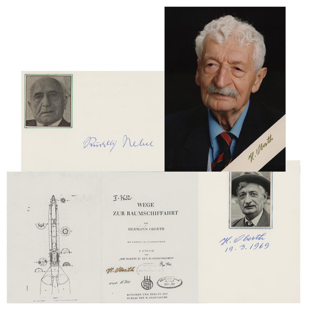 Four items signed by the German rocket pioneers: a color satin-finish 5 x 7 photo of Oberth, signed in black felt tip, "H. Oberth"; a fountain pen signature, "H. Oberth, 19.3.1969," on an off-white 4 x 5.75 card bearing an affixed portrait; a 7.25 x 5.5 copy of the title page and frontispiece of Oberth's book Wege Zur Raumschiffahrt, signed in black felt tip, "H. Oberth"; and a ballpoint signature, "Rudolf Nebel," on an off-white 5.75 x 4 card bearing an affixed portrait. In fine condition.