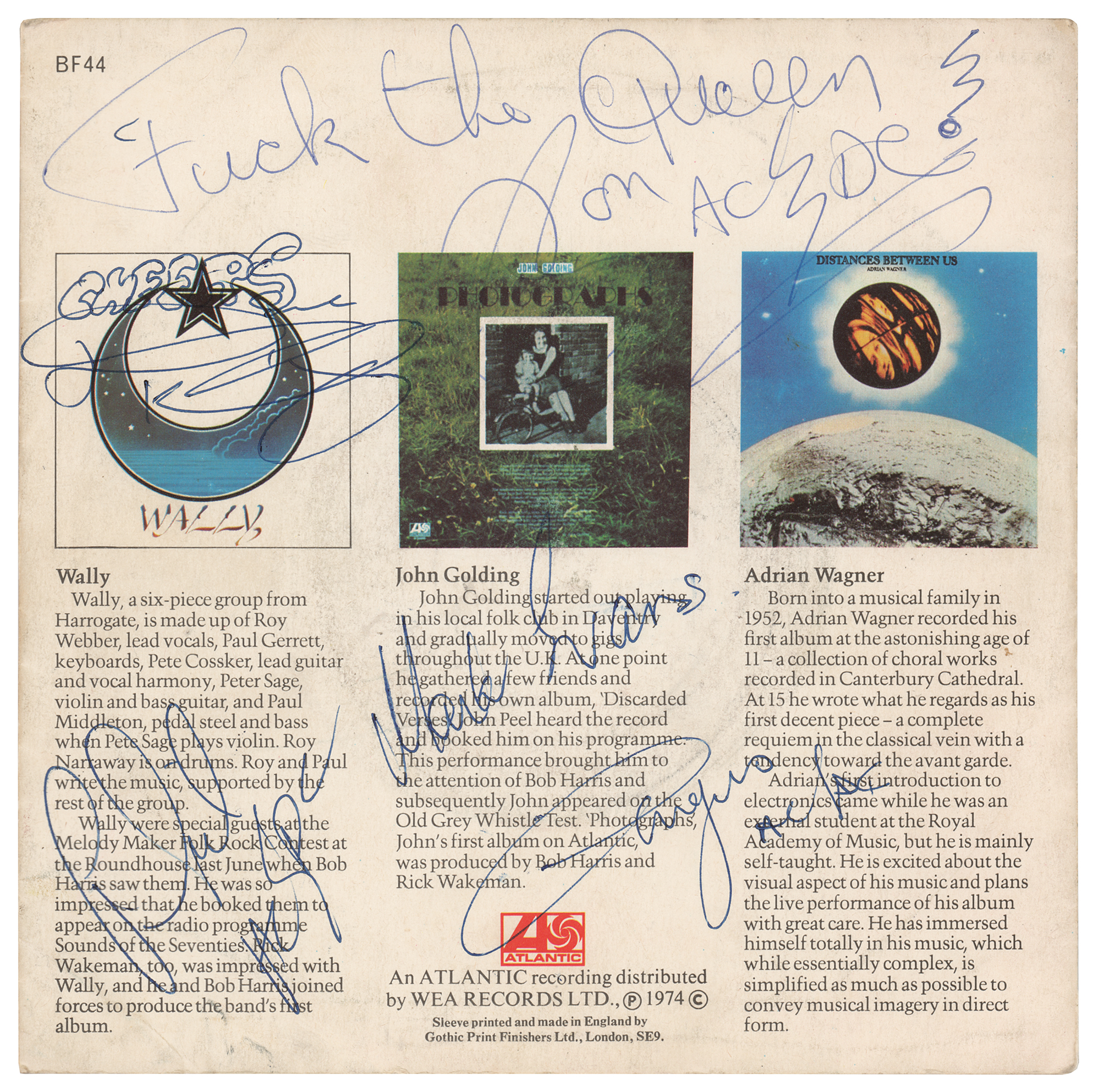 Atlantic Records 45 RPM record entitled 'Best Of British: Try A Little Taste,' signed on the back of the picture sleeve in blue ballpoint, "Fuck the Queen! Bon, AC/DC," "Angus [Young], AC/DC," "Phil Rudd, AC/DC," "Mark Evans," and "Cheers, George Young." George Young was Angus's older brother who produced the first four AC/DC albums. In fine condition. The record is included.