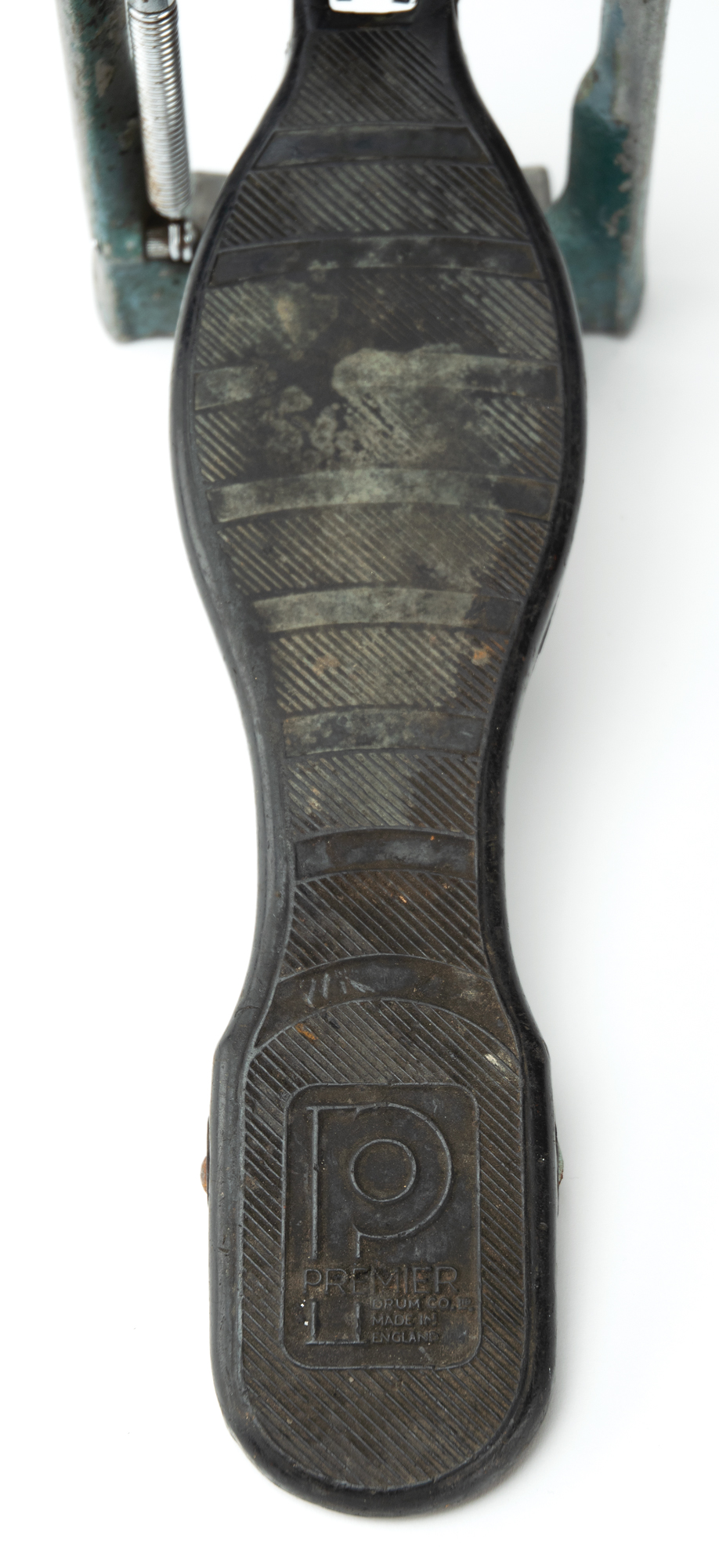 Cream drummer Ginger Baker's personally-owned and -used single bass drum pedal, made in England by the Premier Drum Co. The piece features a rubberized pedal and wooden bass drum beater. In very good to fine condition, with obvious signs of use. Ex. Omega Auctions.