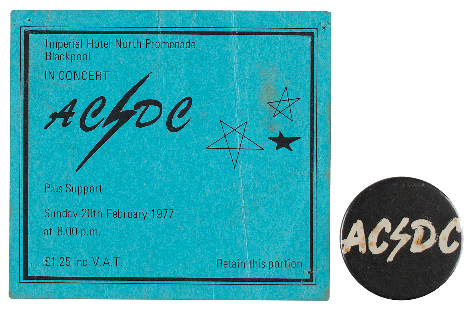 Two vintage AC/DC items: a blue cardstock 4 x 3.5 ticket stub from their show at the Imperial Hotel North Promenade, Blackpool, Lancashire, England on February 20, 1977, numbered "569" on the reverse; and an original vintage black 1.5″ diameter button from 1977, with white text, "AC/DC." In very good to fine condition, with scattered light stains, and some creasing and tack holes to the ticket stub.
