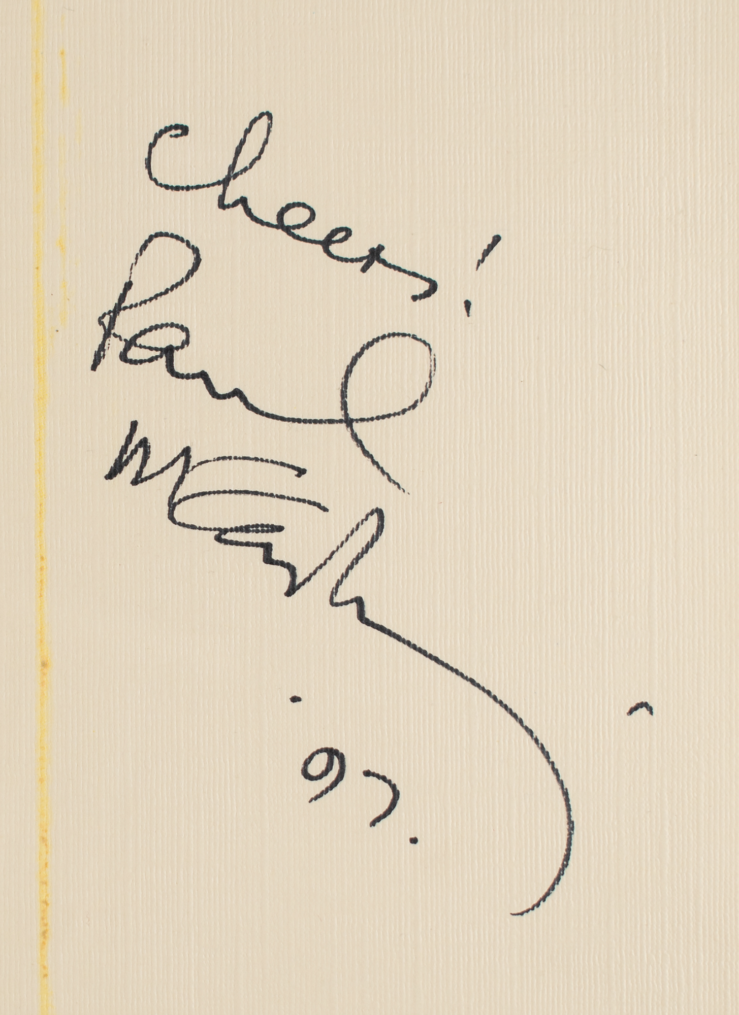 Color 18 x 18 promo poster for McCartney's 1997 solo album Flaming Pie, boldly signed in black felt tip, "Cheers! Paul McCartney, '97." Rolled and in very fine condition. Consignor notes that this was obtained from one of McCartney's employees.