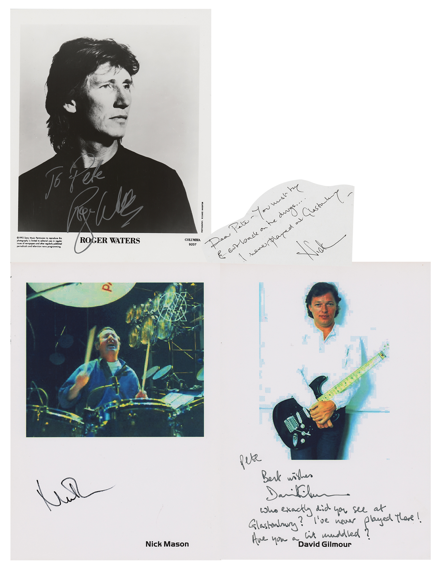 Unique group of four items signed by three members of the group: a satin-finish 8 x 10 Columbia promo photo of Roger Waters, signed and inscribed in silver ink, "To Pete, Roger Waters"; an ANS by Nick Mason, signed "Nick," on a clipped 6 x 3.25 slip, in full: "Dear Pete—You must try & cut back on the drugs? I never played at Glastonbury"; a color image of Mason playing the drums printed on an 8.25 x 11.75 sheet, signed in black felt tip, "Nick Mason"; and a color image of Gilmour with his guitar printed on an 8.25 x 11.75 sheet, signed and inscribed in black ink, "Pete, Best wishes, David Gilmour, Who exactly did you see at Glastonbury? I've never played there! Are you a bit muddled?" In overall fine condition, with a couple of creases to the Waters photo and pixelation to the color images. A desirable lot with seldom-seen, playful notes by two of Pink Floyd's musicians.