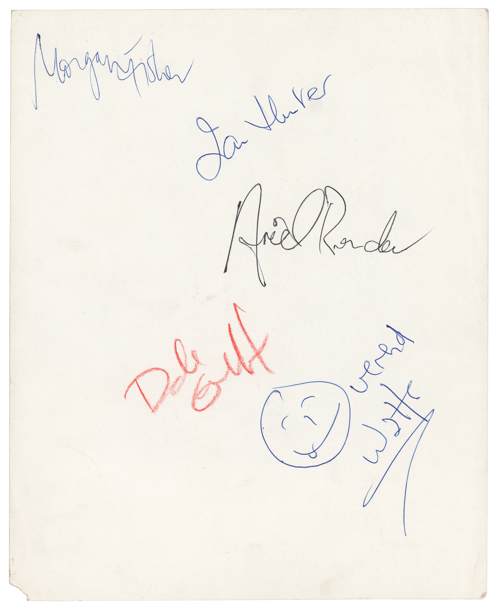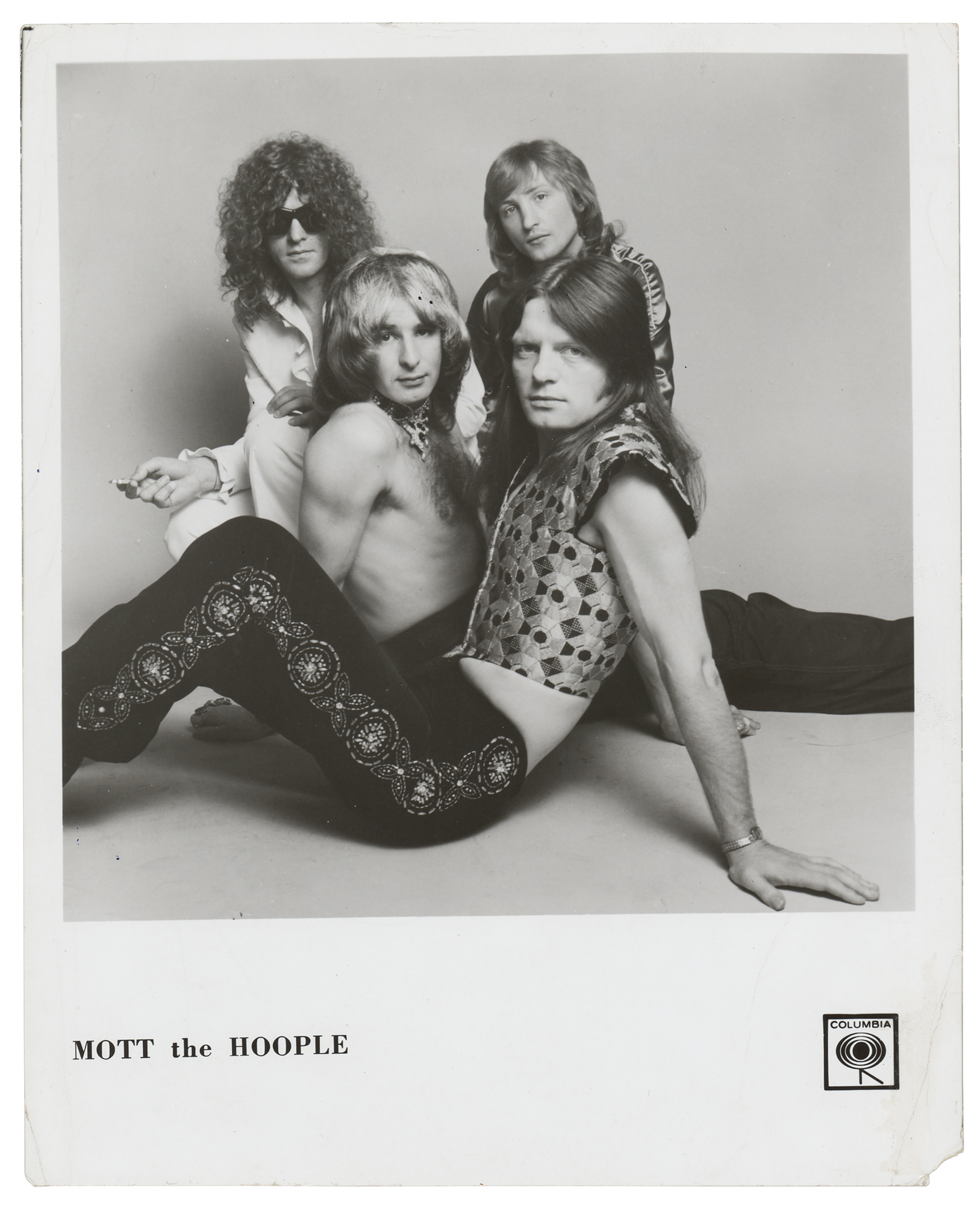 Vintage circa mid-1970s glossy 8 x 10 Columbia promo photo of Mott the Hoople, signed on the reverse in various inks by Ian Hunter, Ariel Bender, Morgan Fisher, Overend Watts, and Dale Griffin (red crayon). In very good to fine condition, with some creasing, loss to the lower right corner tip, and surface impressions to the photo from the signatures on the back.