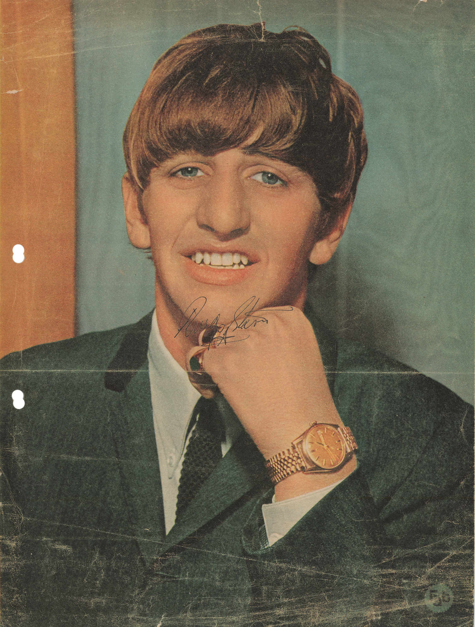 Oversized color 10.25 x 13.5 magazine photo of Starr posing with a golden watch, signed in black ballpoint, "Ringo Starr." In very good condition, with punch holes to the left edge, a tear to the top edge, a horizontal fold, and overall creasing, heaviest to the bottom.