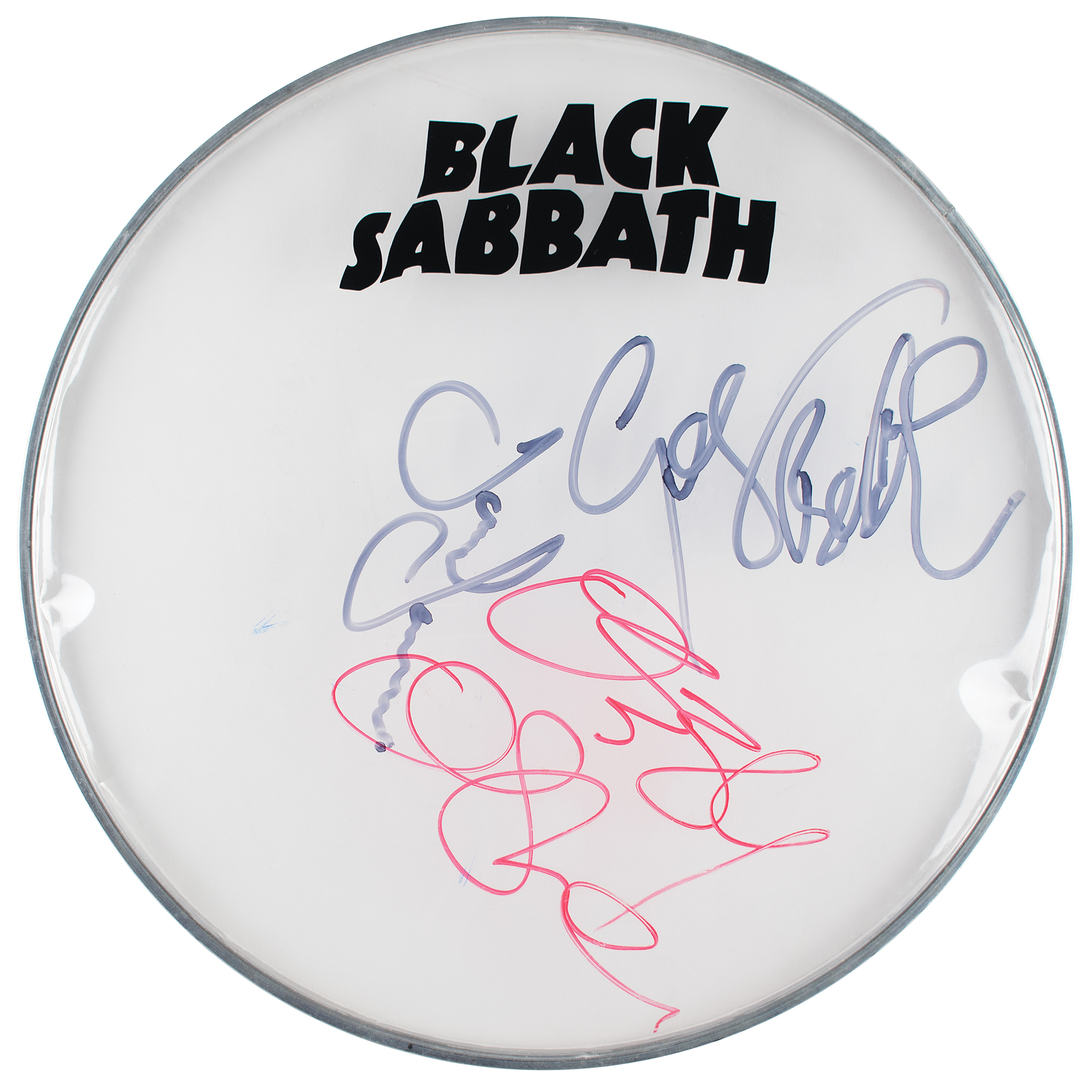 Clear 12.5″ drum head with applied "Black Sabbath" lettering, signed in felt tip by Ozzy Osbourne, Tony Iommi, and Geezer Butler. In very good to fine condition, with some light scuffing and scratching.