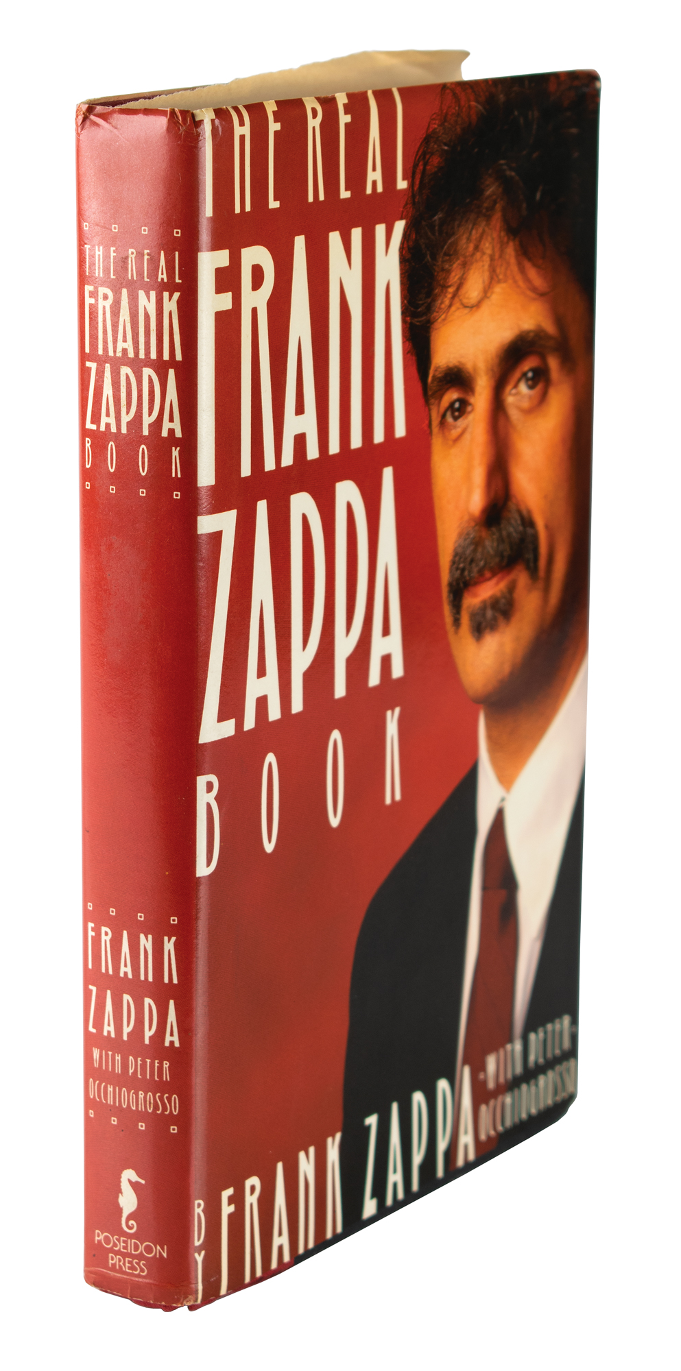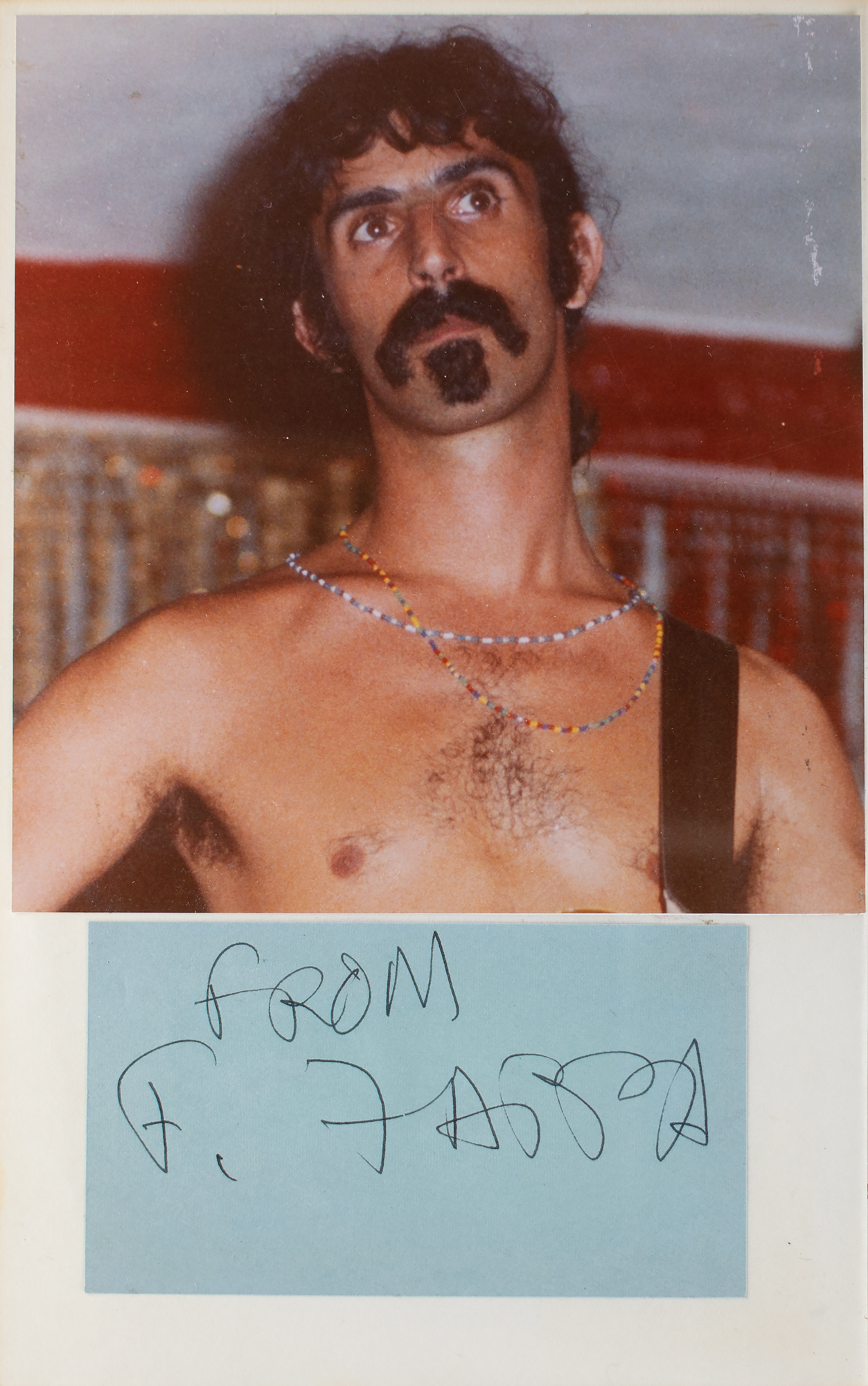 Ink signature, "From F. Zappa,” on a light blue 4.25 x 2.5 slip, affixed below a color photograph opposite the title page inside a first edition of The Real Frank Zappa Book, hardcover with dust jacket, published by Poseidon Press in 1989. In fine condition. Accompanied by a certificate of authenticity from Tracks.