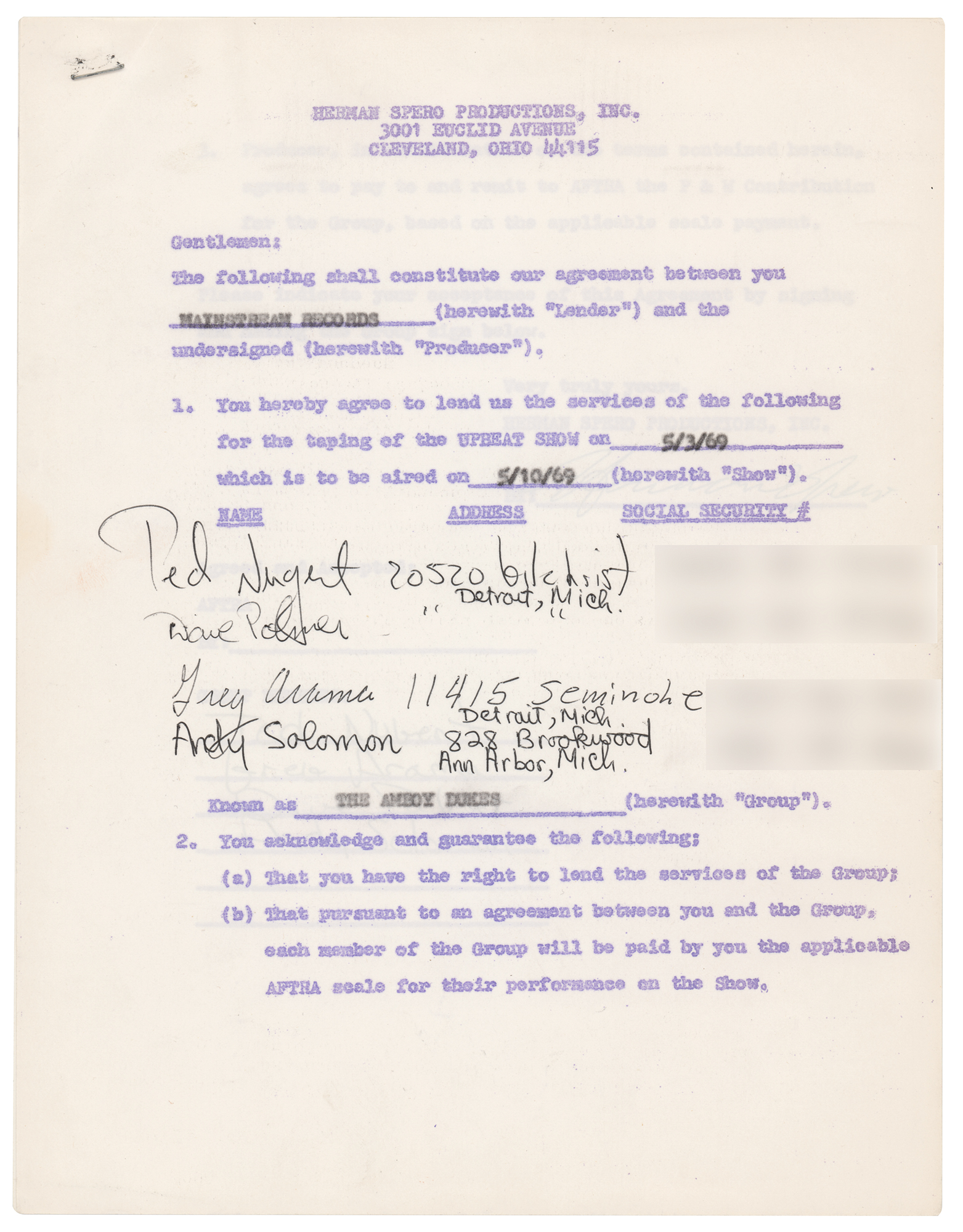 DS, two pages, 8.5 x 11, April or May 1969. Contract between Mainstream Records and Herman Spero Productions, with the former agreeing to lend the services of "The Amboy Dukes" for the taping of "the Upbeat Show on 5/3/69 which is to be aired on 5/10/69." Signed on the first page in black ballpoint by Ted Nugent, Dave Palmer, Greg Arama, and Andy Solomon, with each adding their address and social security number. The last page is signed by Herman Spero. In fine condition.