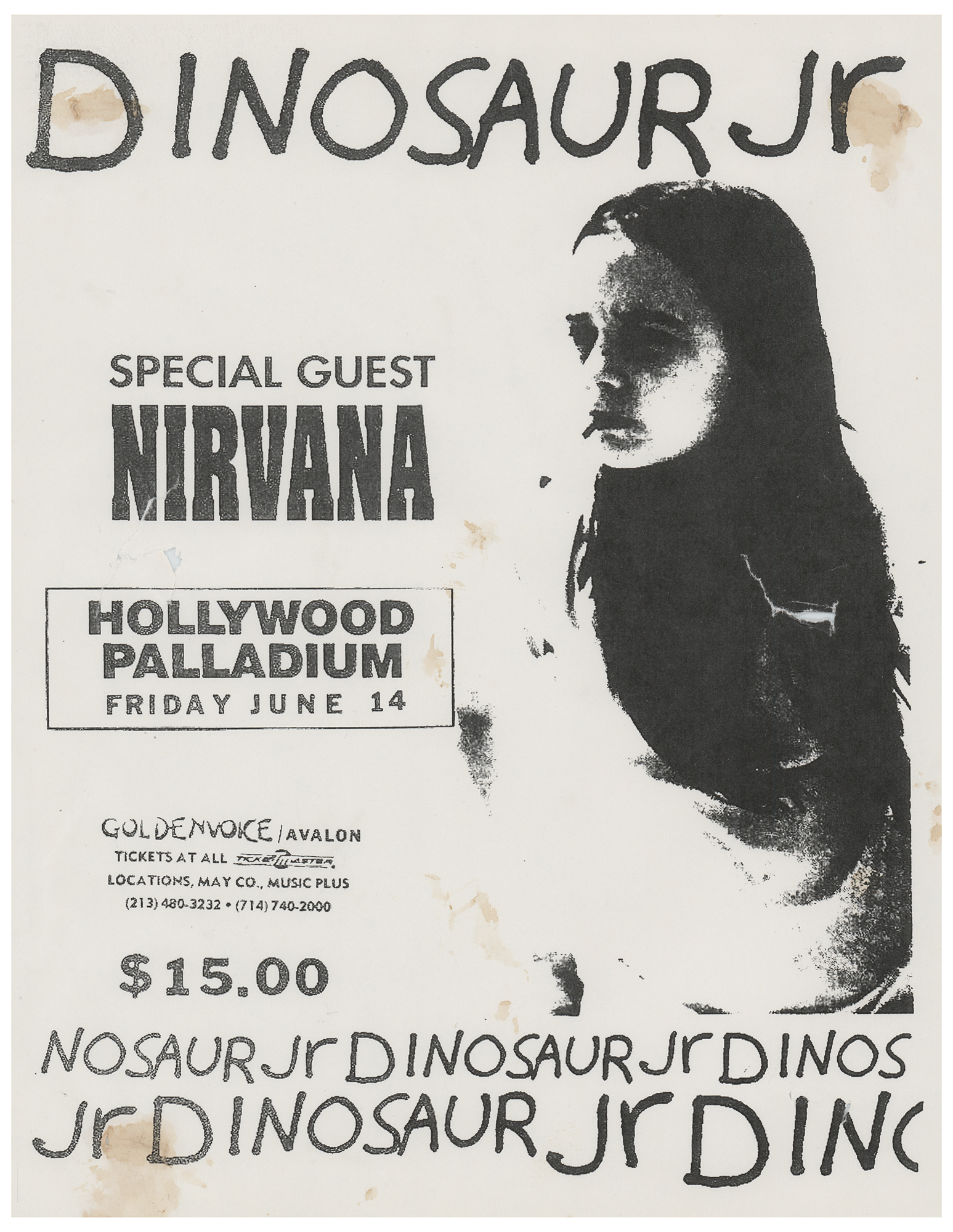 Original 8.5 x 11 flyer for a Dinosaur Jr. and Nirvana concert at the Hollywood Palladium in Los Angeles, California, on June 14, 1991, which shows a child smoking a cigarette and lists the future grunge legends as the special guest. In very good to fine condition, with light creasing, scattered stains, and two tears. Nirvana were just finishing the recording of their major label debut, Nevermind, when they opened for Dinosaur Jr. at the Hollywood Bowl. Although not mentioned on the flyer, Hole was the opening band and this show is thought to be where Kurt Cobain first befriended Courtney Love.