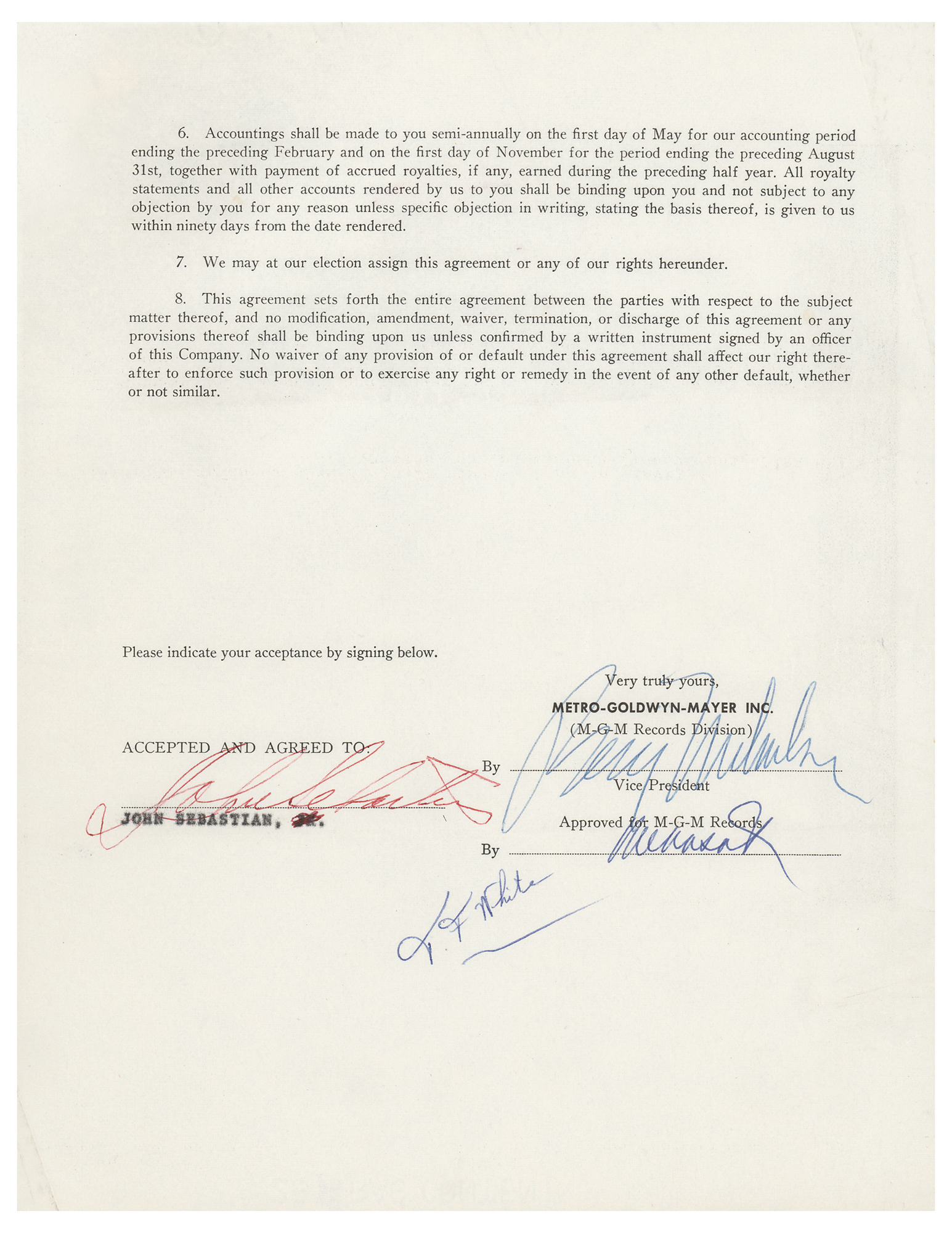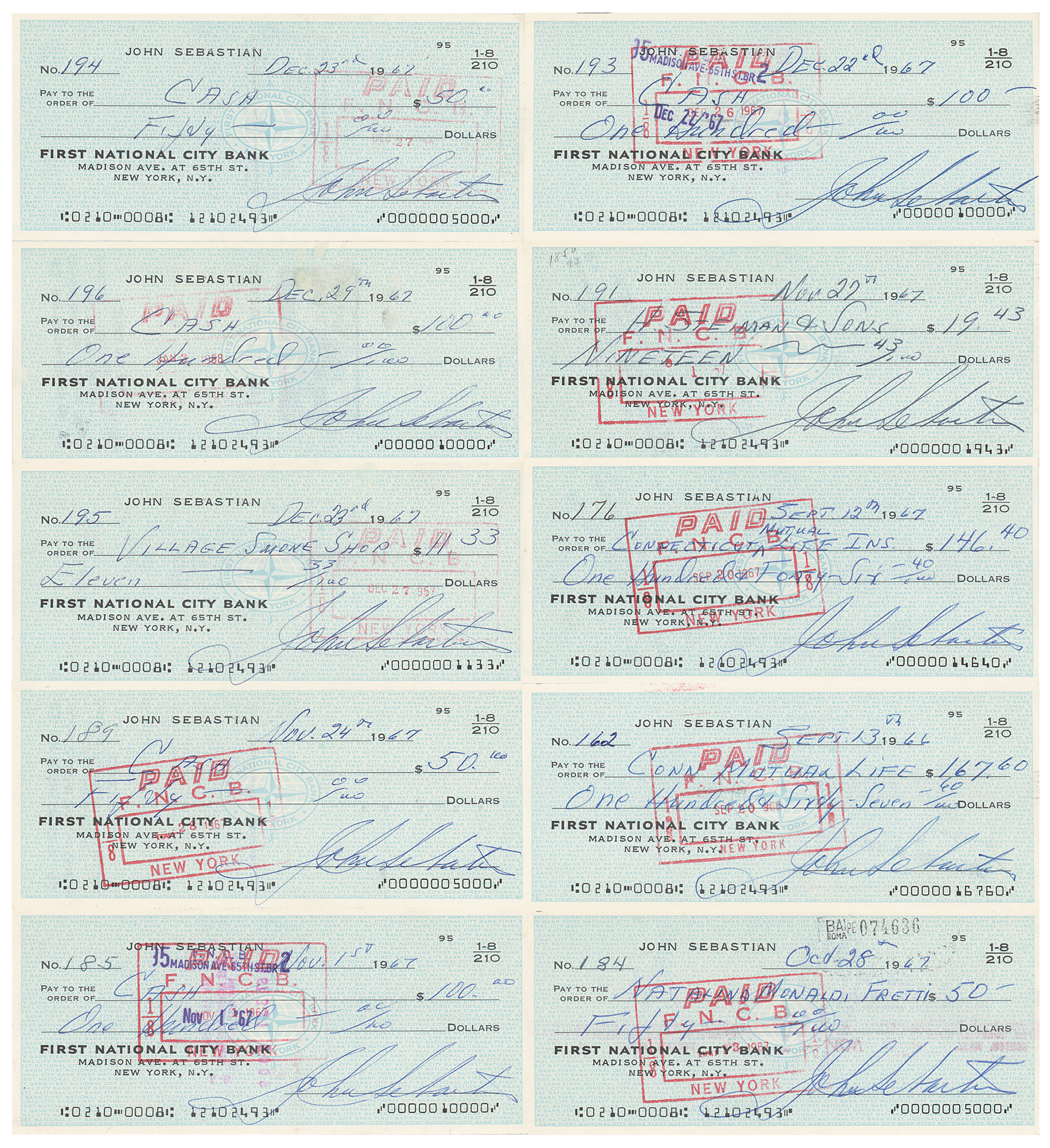 Group lot of 11 items signed by John Sebastian of The Lovin' Spoonful, including: a DS, three pages, 8.5 x 11, October 16, 1967, which concerns an agreement between Sebastian and MGM Records, with the former selling two master recordings entitled "Tcherepnin-Concerto for Harmonica & Orch. Op. 87 and Villa-Lobos-Cncerto for Harmonica & Orch. (1955) as performed by Stuttgard Radio Orchestra, Hans Schweiger (Conductor), and John Sebastian (Harmonica)," for eight percent of the suggested retail price; and a group of 10 personal checks from 1967, all 6.25 x 2.75, each filled out and signed by Sebastian. In overall fine condition.