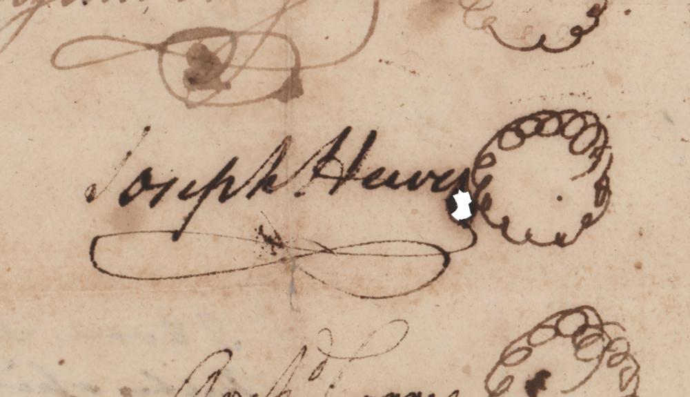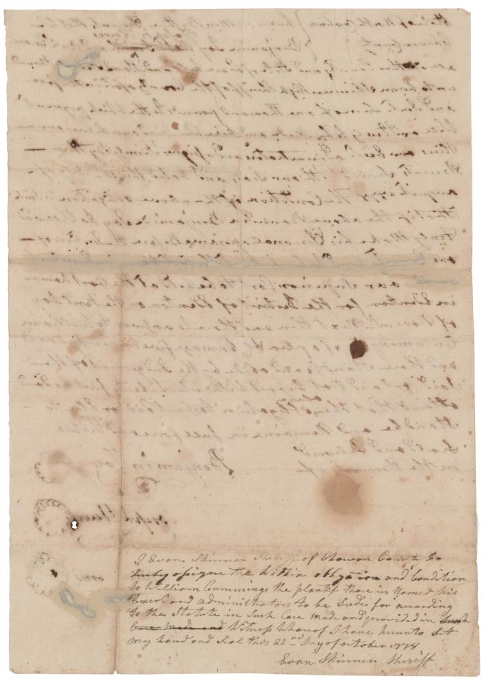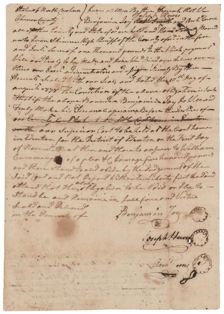 Secretary of the Naval Affairs Committee during the Revolutionary War (1730-1779) who signed the Declaration of Independence, one of only three Quakers to do so. Revolutionary War-dated manuscript DS, one page, 8 x 11.5, August 10, 1777. Document from Chowan County, North Carolina, in part: "Know all men by these presents that Benjamin Joy, Joseph Hewes, and Arch Corry all of the County and State afor'd are held and stand…bound unto Evan Skinner High Sheriff of the County afor'd in the full…sum of one thousand pounds to the which payment will and truly to be made and done like bind ones selves and heirs and Exect. Administrators and signors family by these Presents Sealed with our Seal, and dated the 10th Day of August 1777." Docketed on the reverse by Skinner: "I Evan Skinner Sheriff of Chowan County do hereby assign the within obligation and condition to William Cumming the plaintiff therein named…and administrators to be sued for according to the statute in such care made and provided in. Witness Whereof I have hereto set me hand and seal this 22nd day of October 1778, Evan Skinner Sheriff." In very good to fine condition, with some scattered stains, and professional repairs to areas of ink erosion.