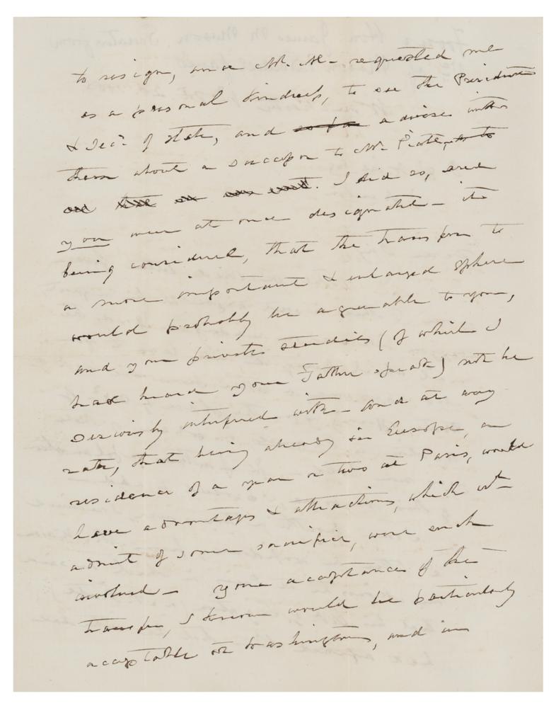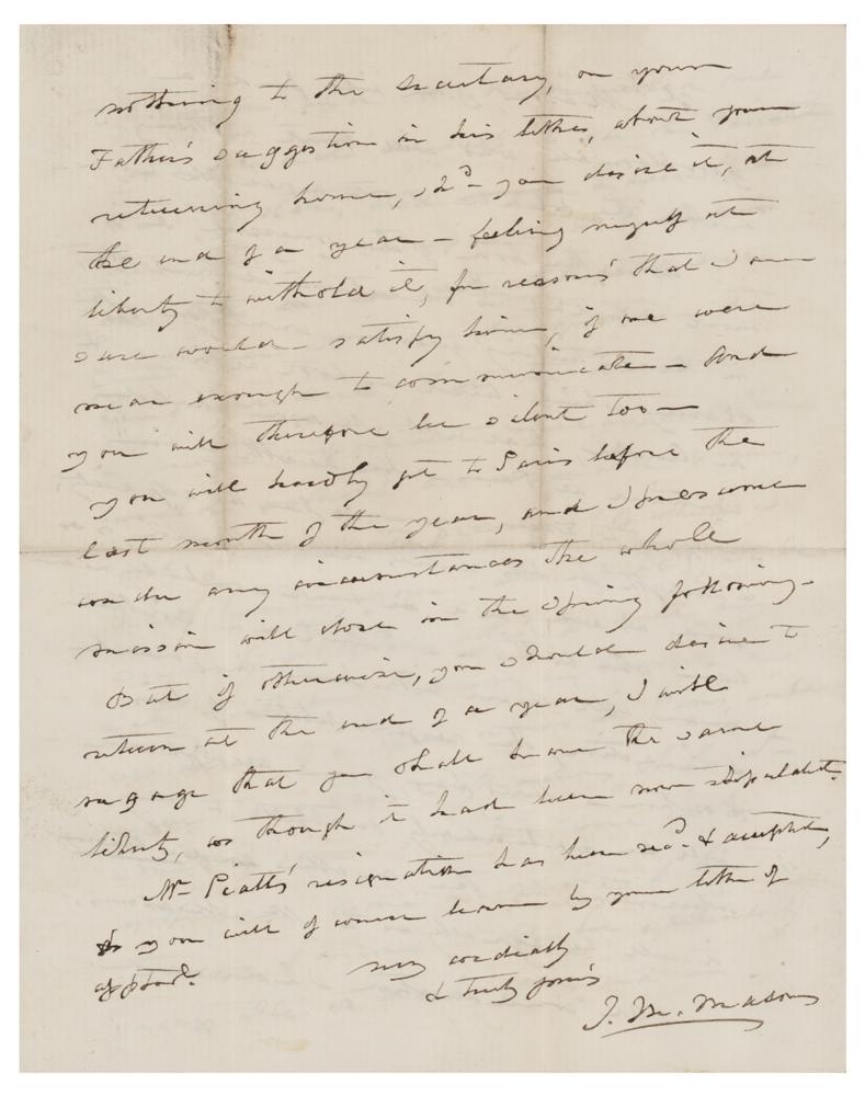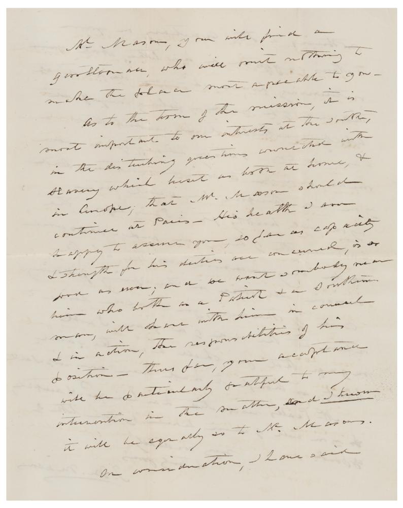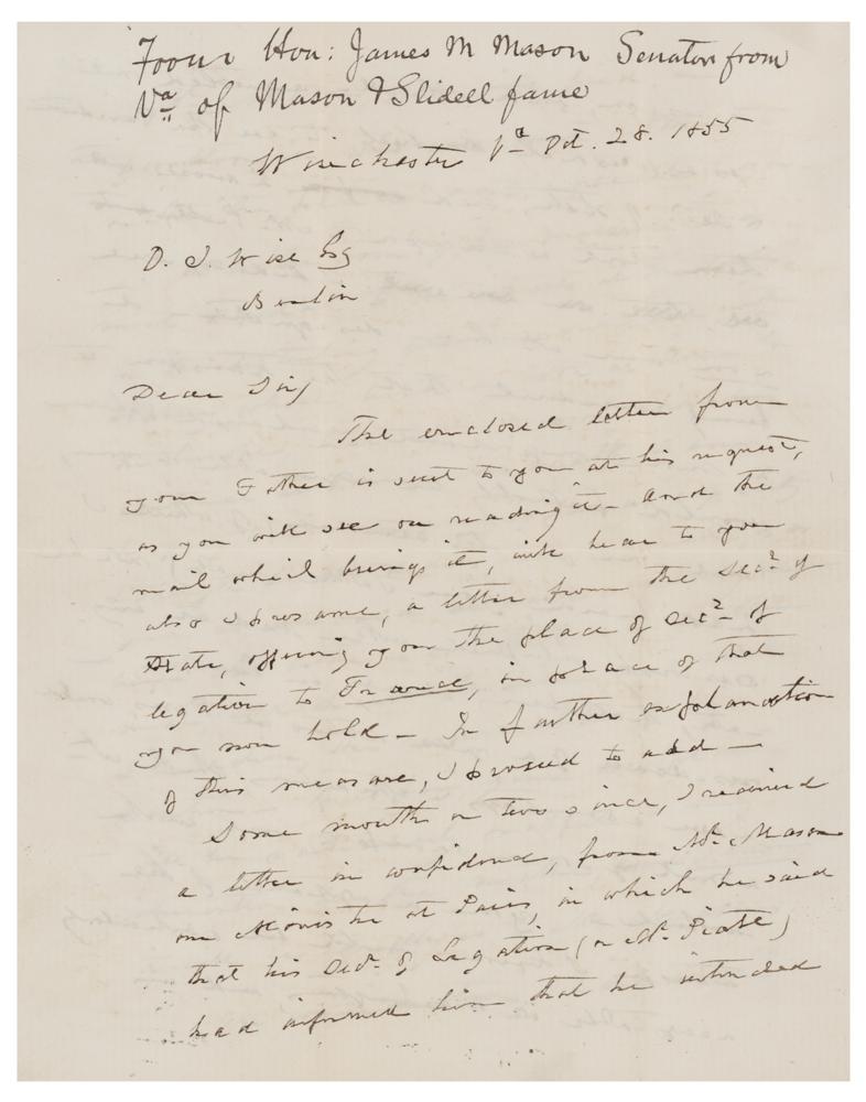 Virginia statesman and jurist (1798-1871) who, as a U.S. senator, drafted the infamous Fugitive Slave Act. As a member of the Confederate Congress, he worked actively as a diplomat to gain European support for the Confederacy. Scarce ALS signed “J. M. Mason,” four pages on two adjoining sheets, 6.75 x 8.5, October 28, 1855. Lengthy handwritten letter to Obadiah Jennings Wise, attaché to the American embassy in Berlin, Germany, son to Virginia Governor Henry A. Wise, and brother to Virginia Congressman John Sergeant Wise. Mason forwards a letter from Wise, Sr., which concerns his placement as the Secretary of Legation to France, a post which he would soon accept. In fine condition.