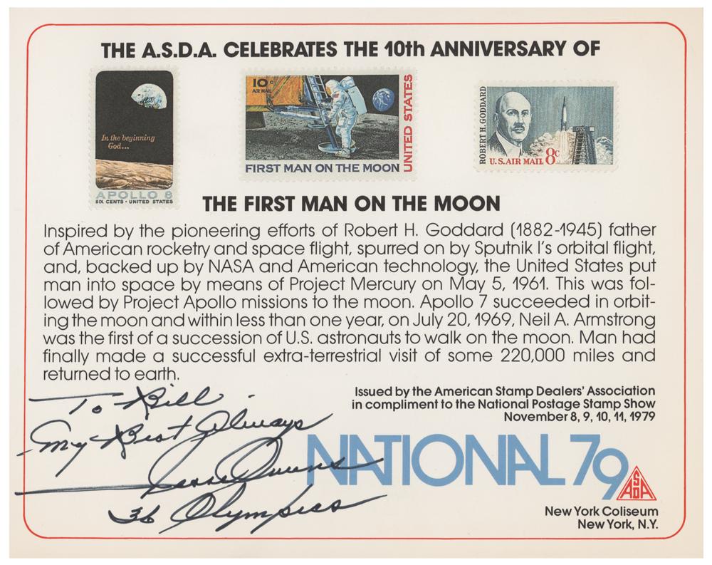 Philatelic souvenir card from the American Stamp Dealers' Association, 7.5 x 6, commemorating the 10th anniversary of the 'First Man on the Moon' stamp, signed and inscribed in black felt tip, "To Bill, My best always, Jesse Owens, 36 Olympics." In very fine condition.