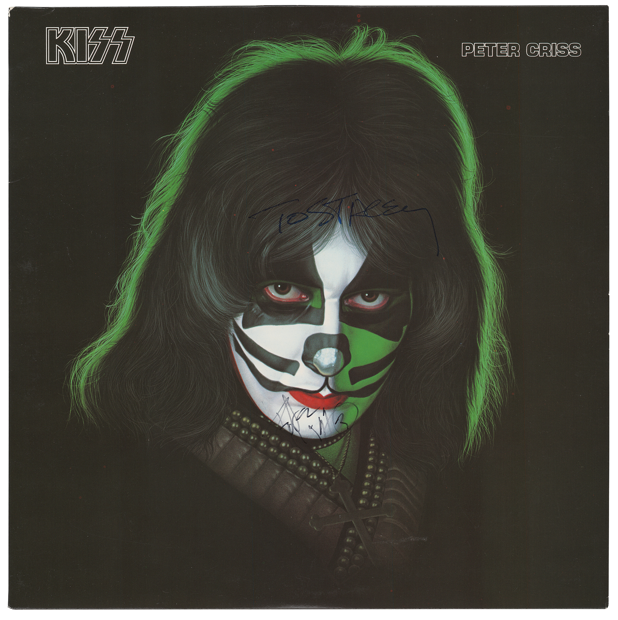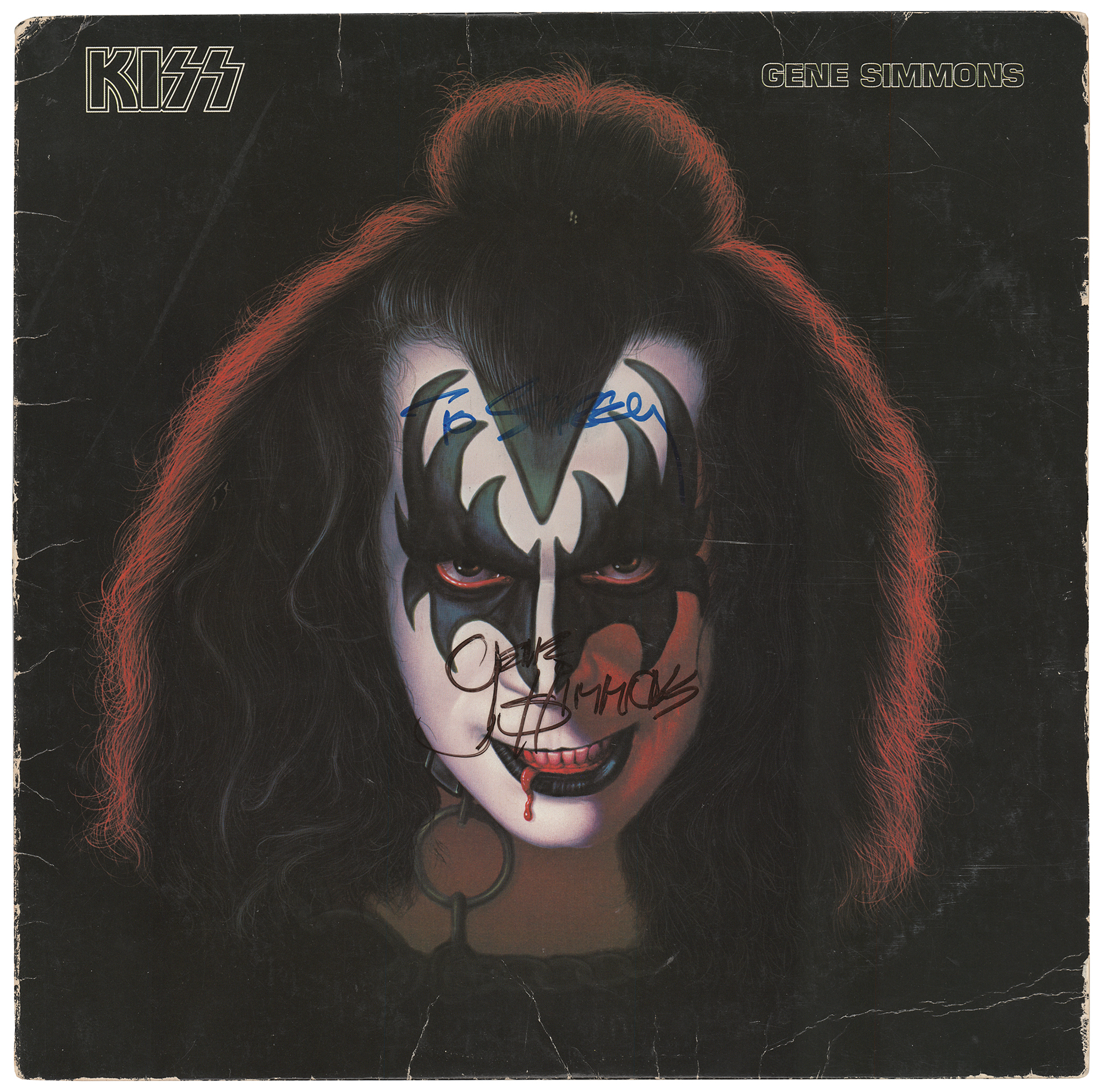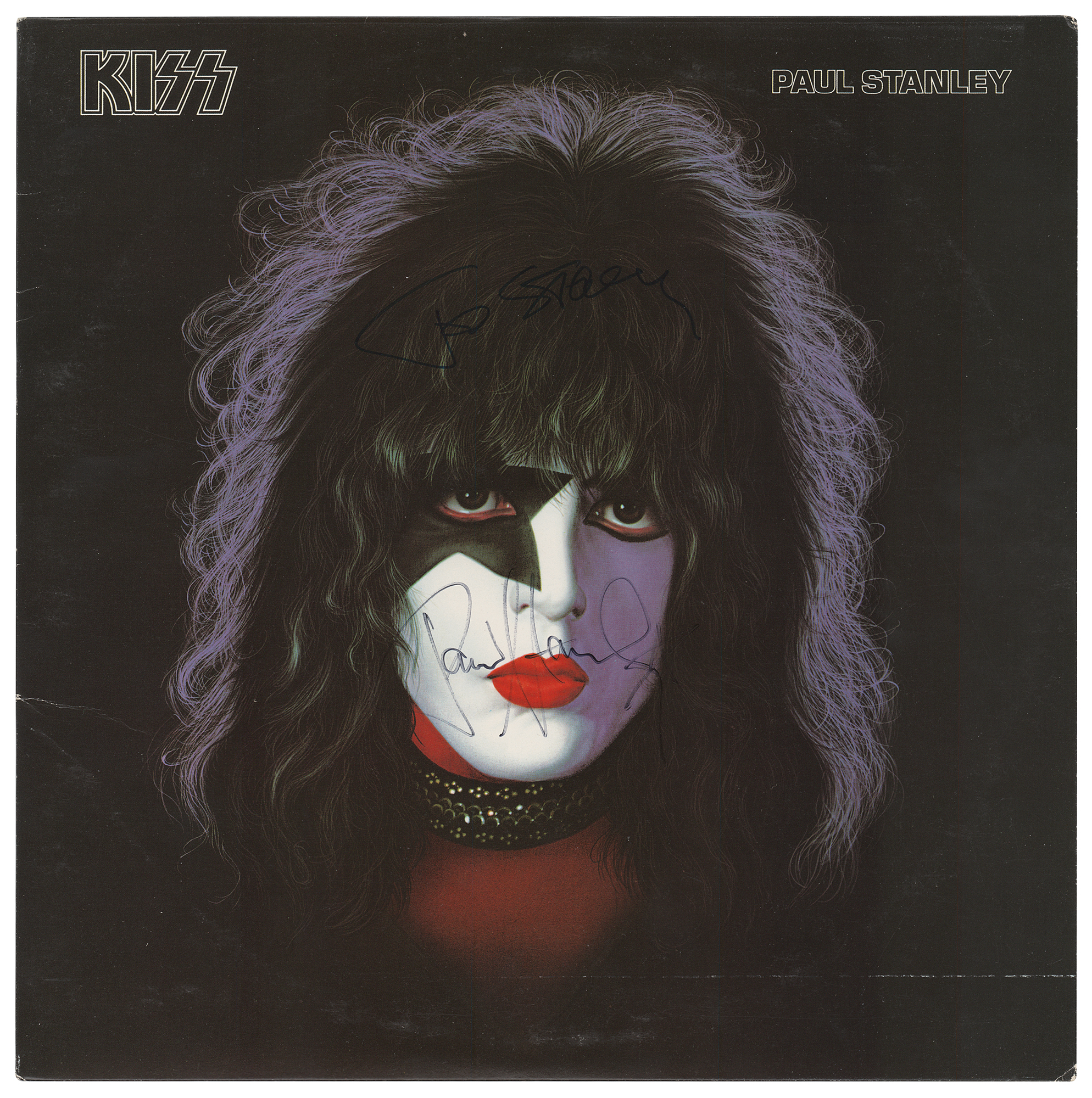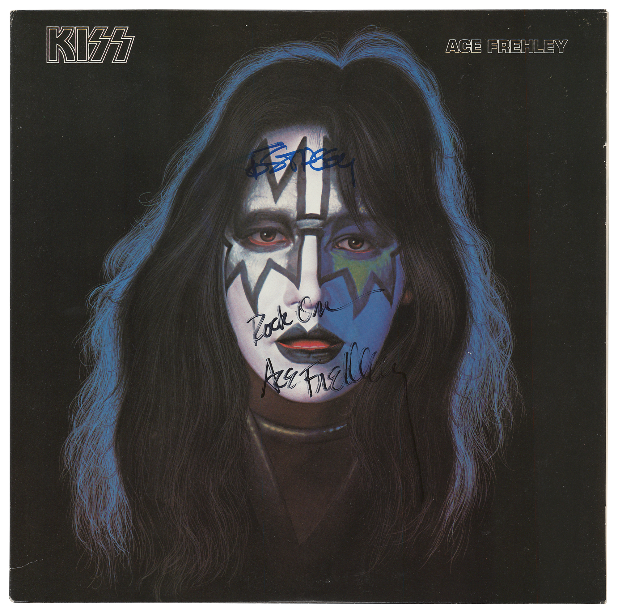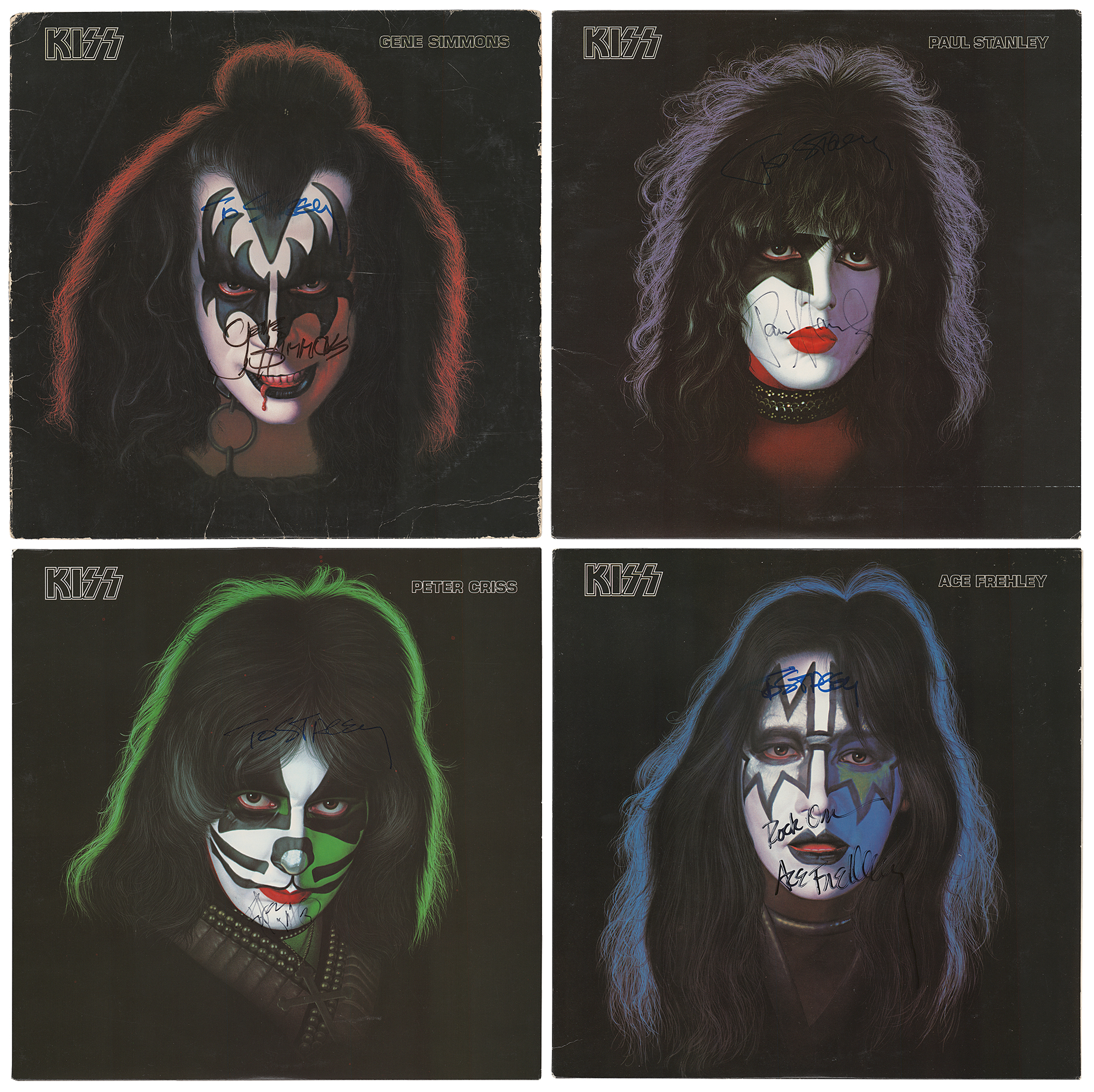 Four self-titled KISS solo albums released by Casablanca Records in 1978, individually signed on the front covers in felt tip by Gene Simmons, Paul Stanley, Peter Criss, and Ace Frehley. Each album is inscribed in an unknown hand to "Stacey." In very good to fine condition, with edge creasing to the Simmons album. The records are included. Includes the original Aucoin transmittal envelope, addressed to Allan Pepper at The Bottom Line, a nightclub in New York City; Pepper had requested the signed albums for his daughter, who was a teenager at the time.