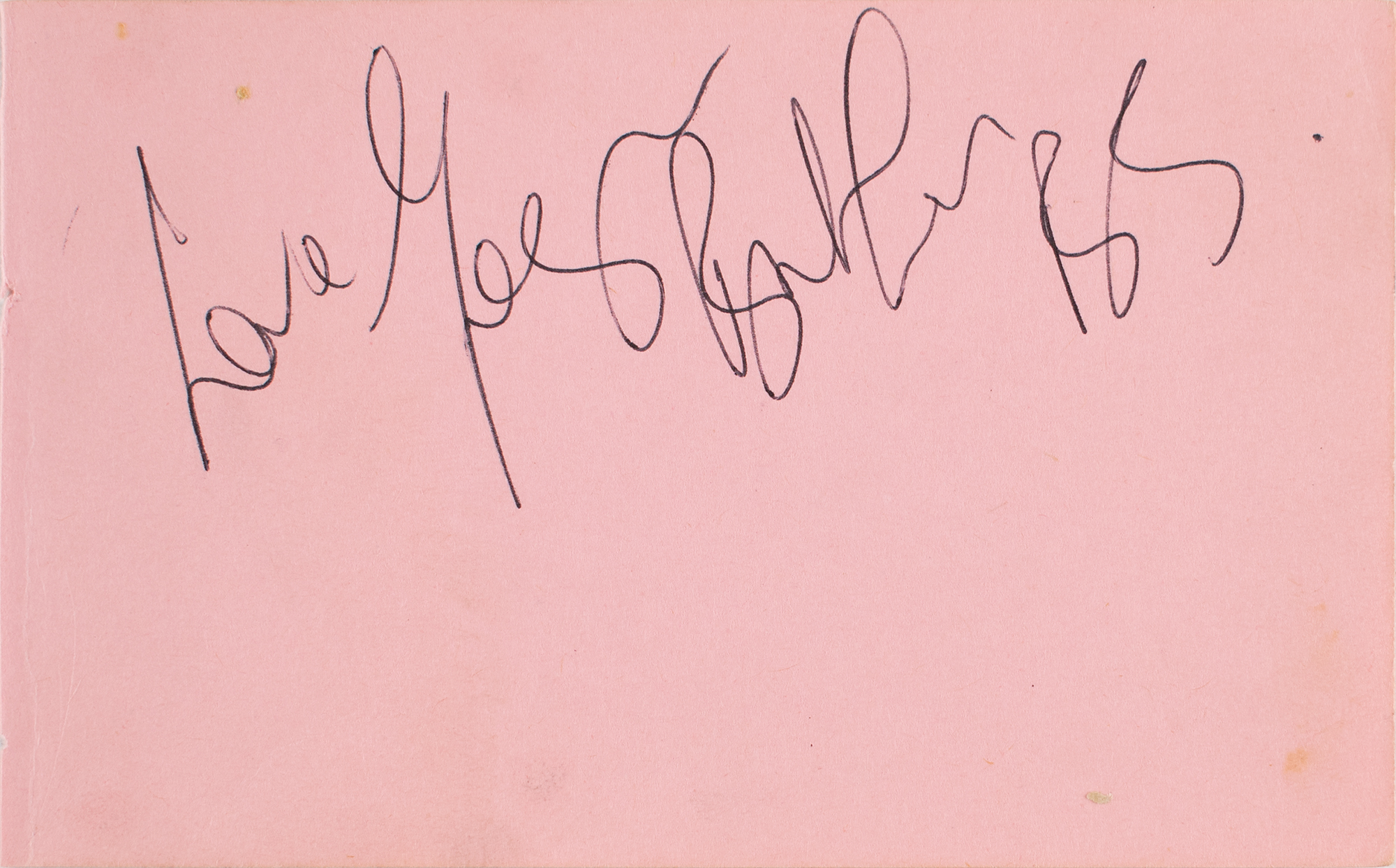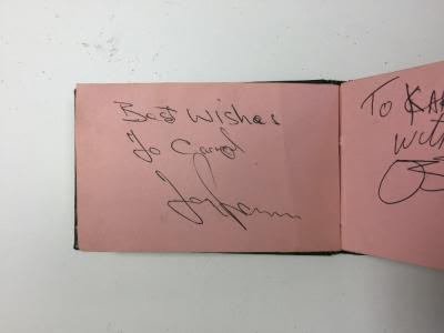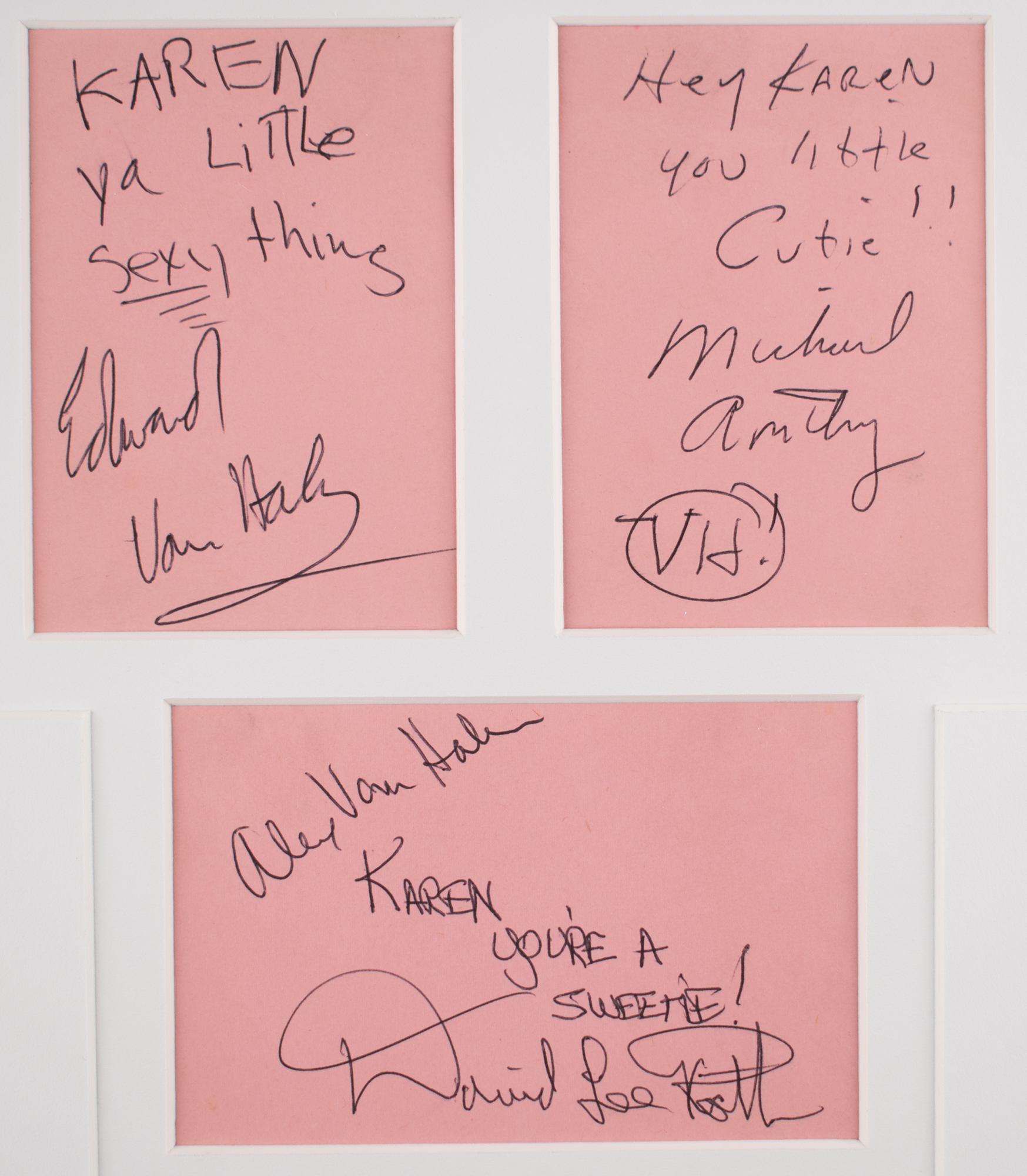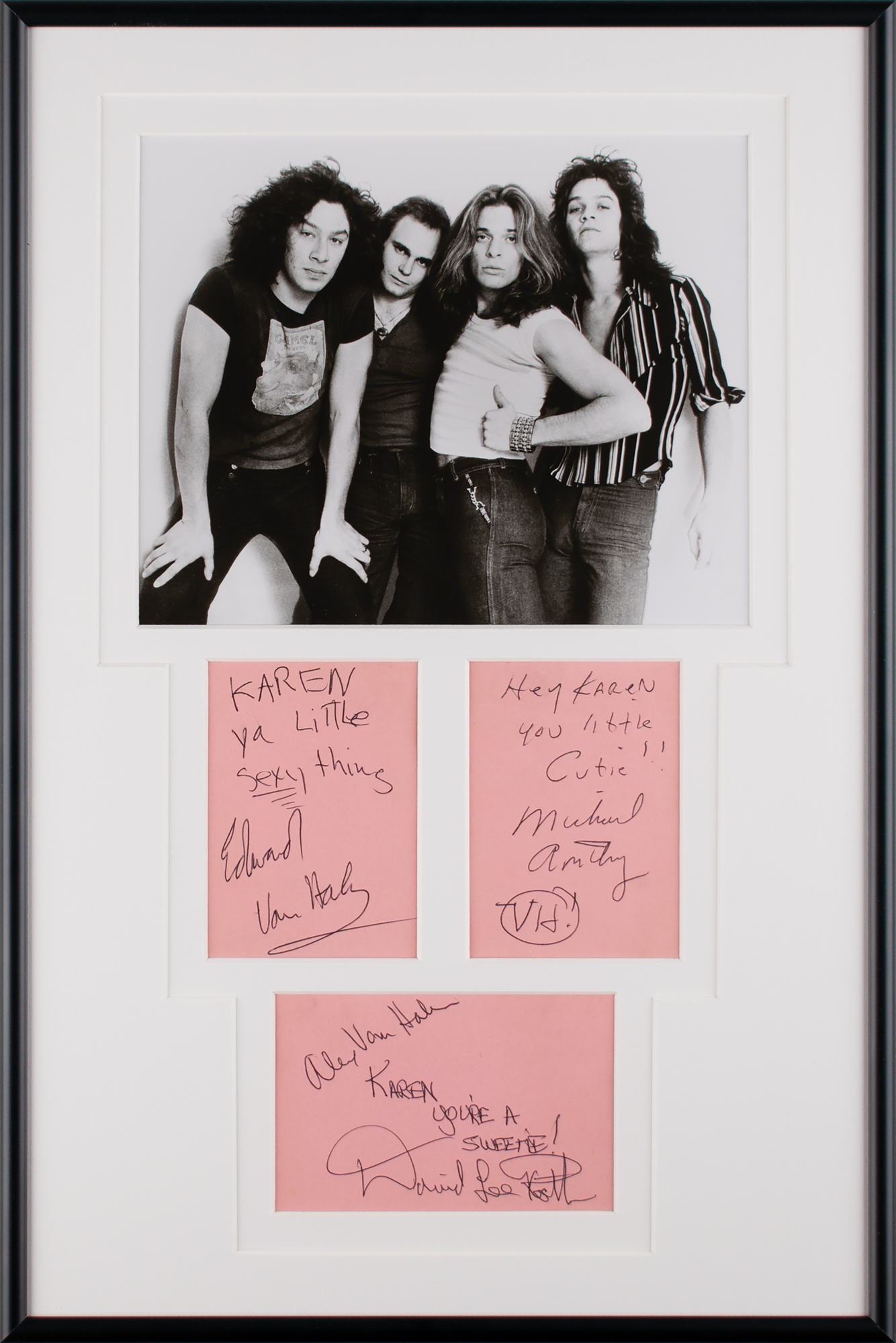 Vintage circa 1978 ballpoint signatures and inscriptions, "Karen, ya little sexy thing, Edward Van Halen," "Hey Karen you little cutie! Michael Anthony, VH," "Alex Van Halen," and "Karen, you're a sweetie! David Lee Roth,” on three pink 2.75 x 4 album pages; the consignor notes that signatures of Black Sabbath's Ozzy Osbourne and Tony Iommi are on the reverse. Double-matted and framed with a photo to an overall size of 11.75 x 17.75. An additional unframed page signed on opposing sides by Bill Ward and Geezer Butler is included. In fine condition. The consignor notes that these signatures were obtained on November 8, 1978, in Birmingham, England, during Van Halen's first tour as the support act for Black Sabbath. Accompanied by a certificate of authenticity from Tracks.
