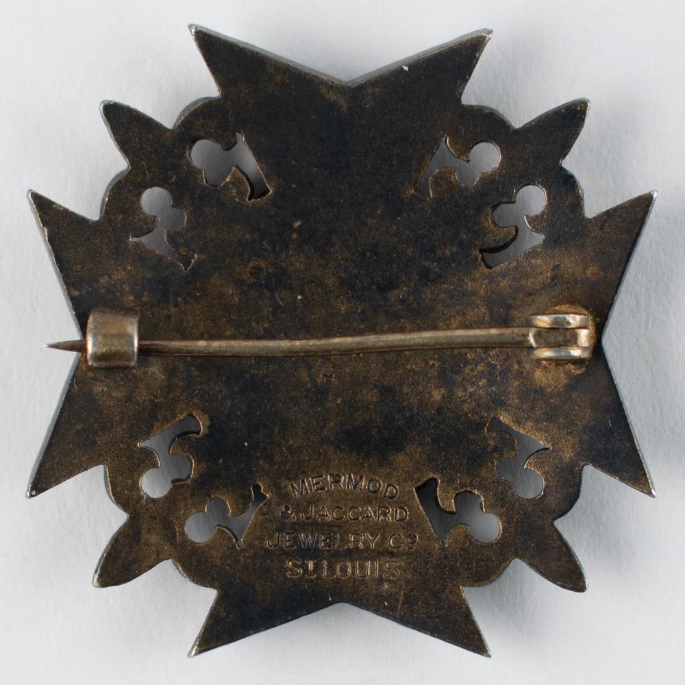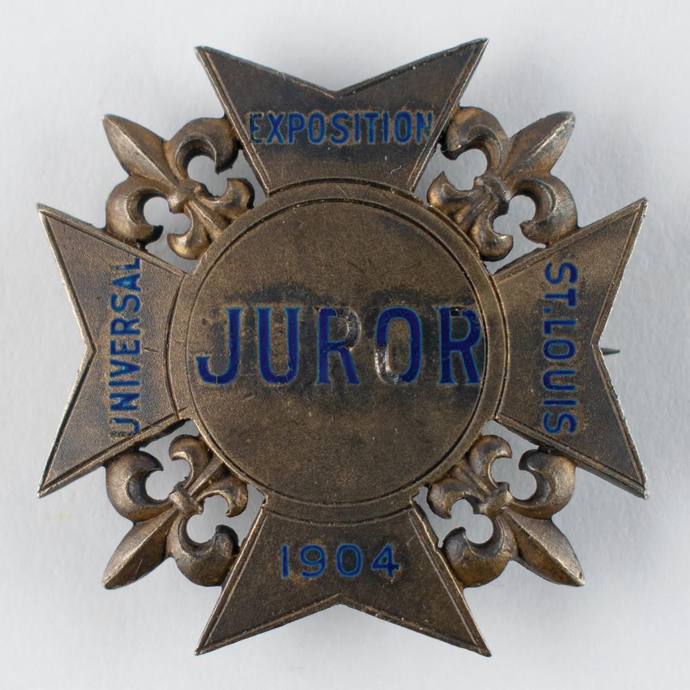 Scarce brass juror badge issued for the 1904 Louisiana Purchase Exposition in St. Louis, which played host to that year's Olympic Games, 32 mm x 32 mm, 11 gm, with center reading in blue enamel, “Juror,” and fleur-de-lis between extensions that read: “Universal Exposition St. Louis 1904.” Reverse bears the maker mark of the Mermod & Jaccard Jewelry, Co. of St. Louis.