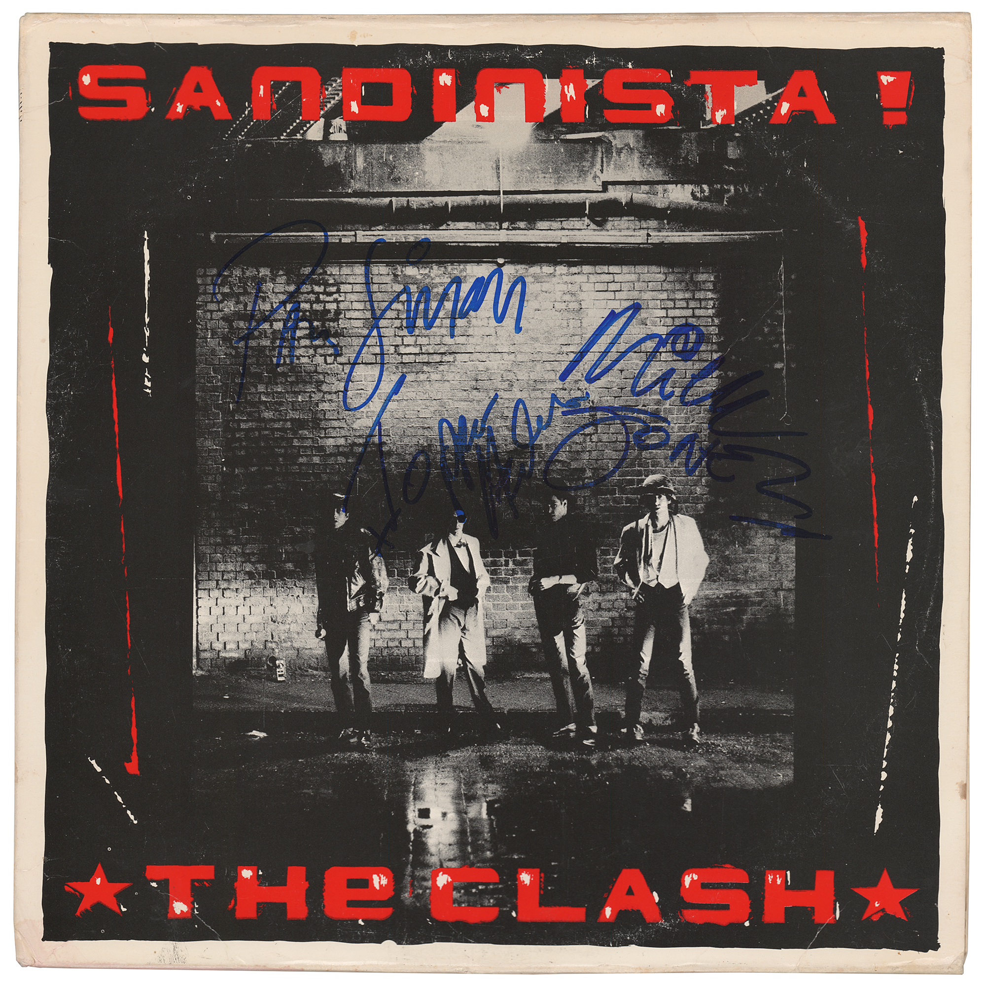 Sandinista! album signed on the front cover in blue felt tip by Paul Simonon, Mick Jones, and Topper Headon. In very good to fine condition, with light scuffing, and some creasing. The records are included.
