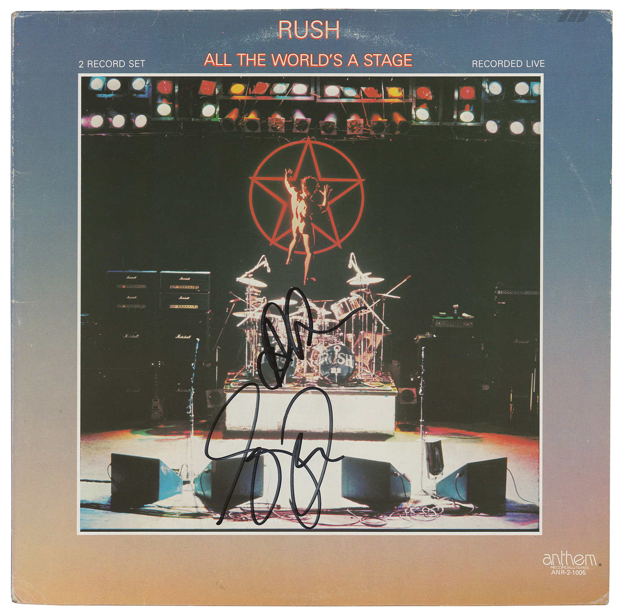 All the World's a Stage album signed on the front cover in black felt tip by Geddy Lee and Alex Lifeson. In fine condition, with light scuffing. The records are included. Consignor notes that the signatures were obtained at the Canadian Songwriters Hall of Fame awards in Toronto, 2010.