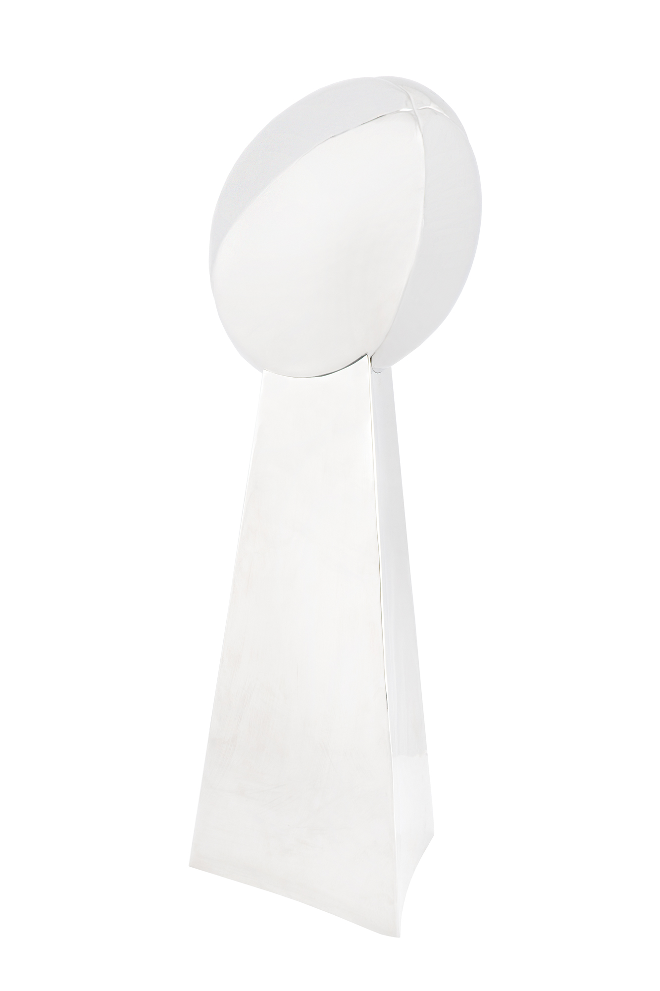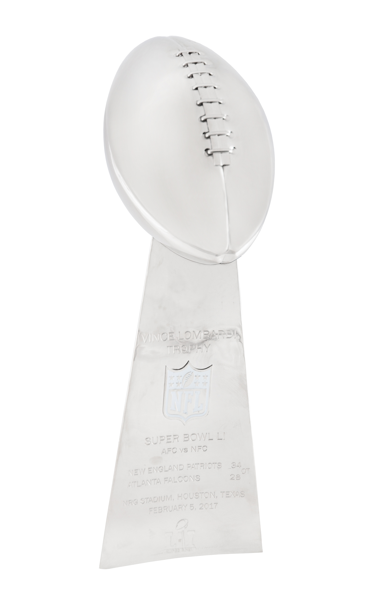 Full-size replica Lombardi trophy, measuring approximately 21″ tall, engraved on the front to honor the victory of New England Patriots in Super Bowl LI: "Vince Lombardi Trophy, Super Bowl LI, AFC vs. NFC, New England Patriots 34, Atlanta Falcons 28, OT, NRG Stadium, Houston Texas, February 5, 2017." Also features the logos of the NFL and Super Bowl LI. In fine condition. On February 5, 2017, in one of the most memorable Super Bowls ever played, Tom Brady led the Patriots to victory over the Falcons, overcoming a 28-3 deficit in the process. Brady was named Super Bowl MVP for a record fourth time.