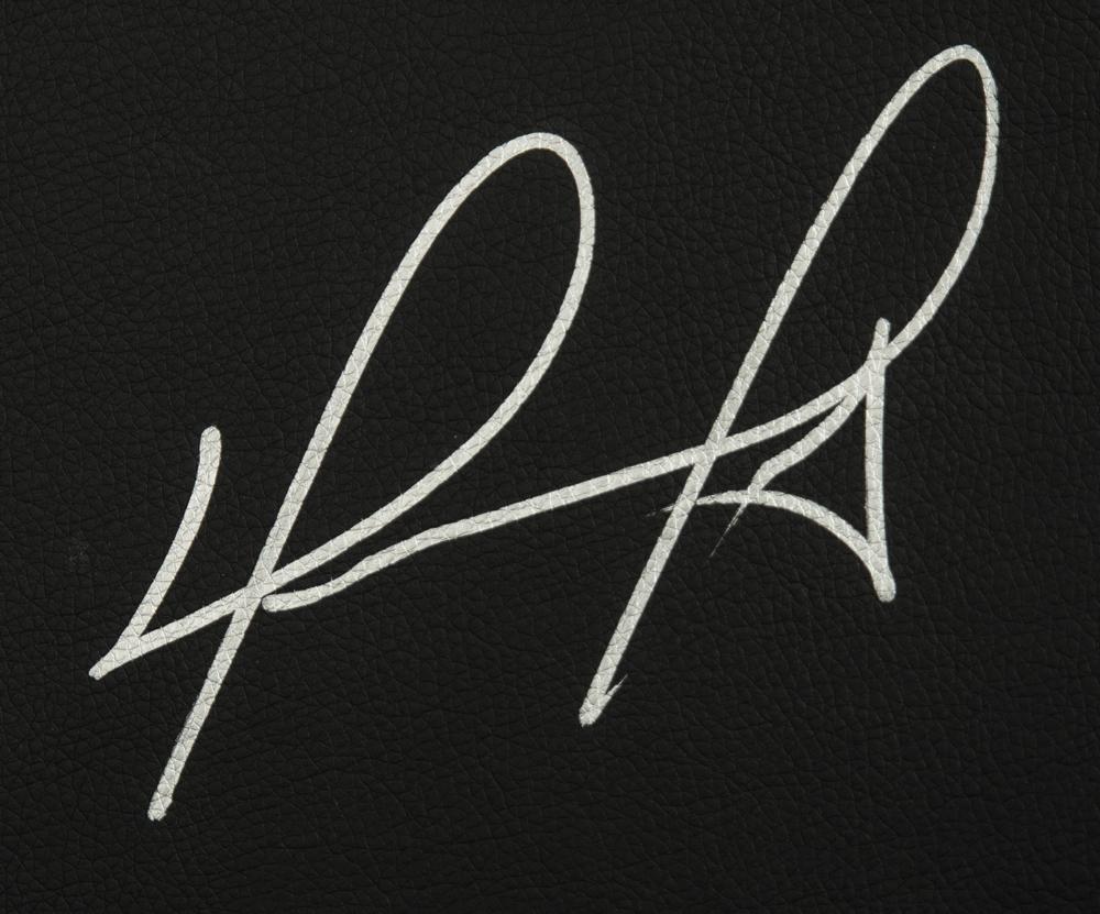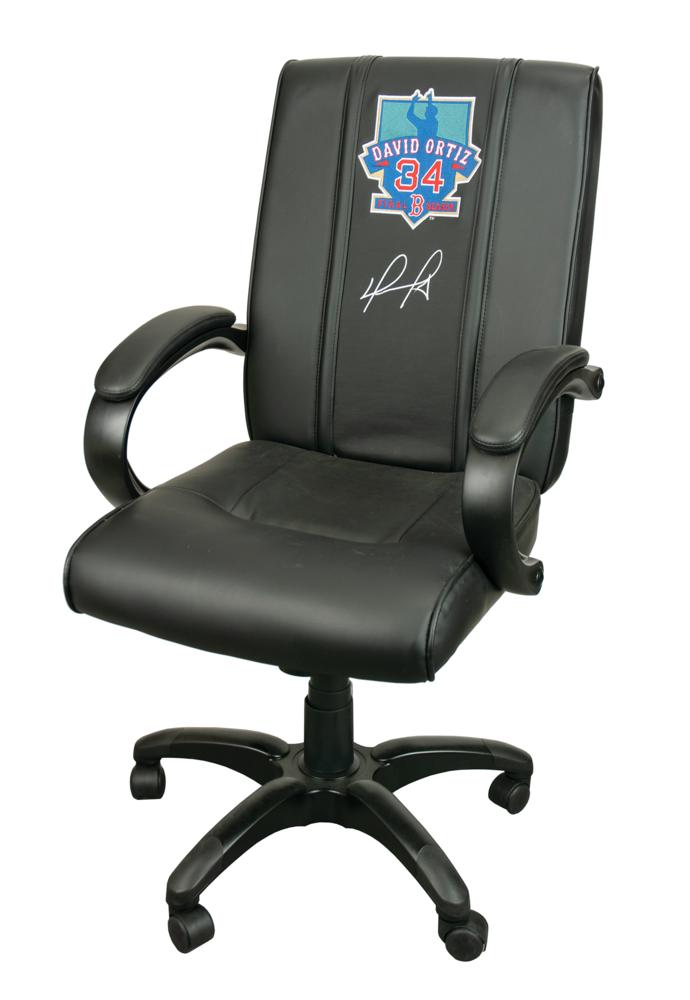 Game-used 'DreamSeat' office chair from the Boston Red Sox clubhouse at Fenway Park, used on September 17, 2016, signed on the seatback in silver ink by David Ortiz, below a large embroidered 'David Ortiz, 34, Final Season' patch. In fine condition, with MLB holograms on the reverse to certify game-used status and the signature. The Red Sox beat the New York Yankees 6 to 5 on September 17th, with Ortiz contributing an RBI as the number three hitter. A great piece from one of Boston's fan favorites, made more desirable as a game-used item from the heated Boston vs. New York rivalry.