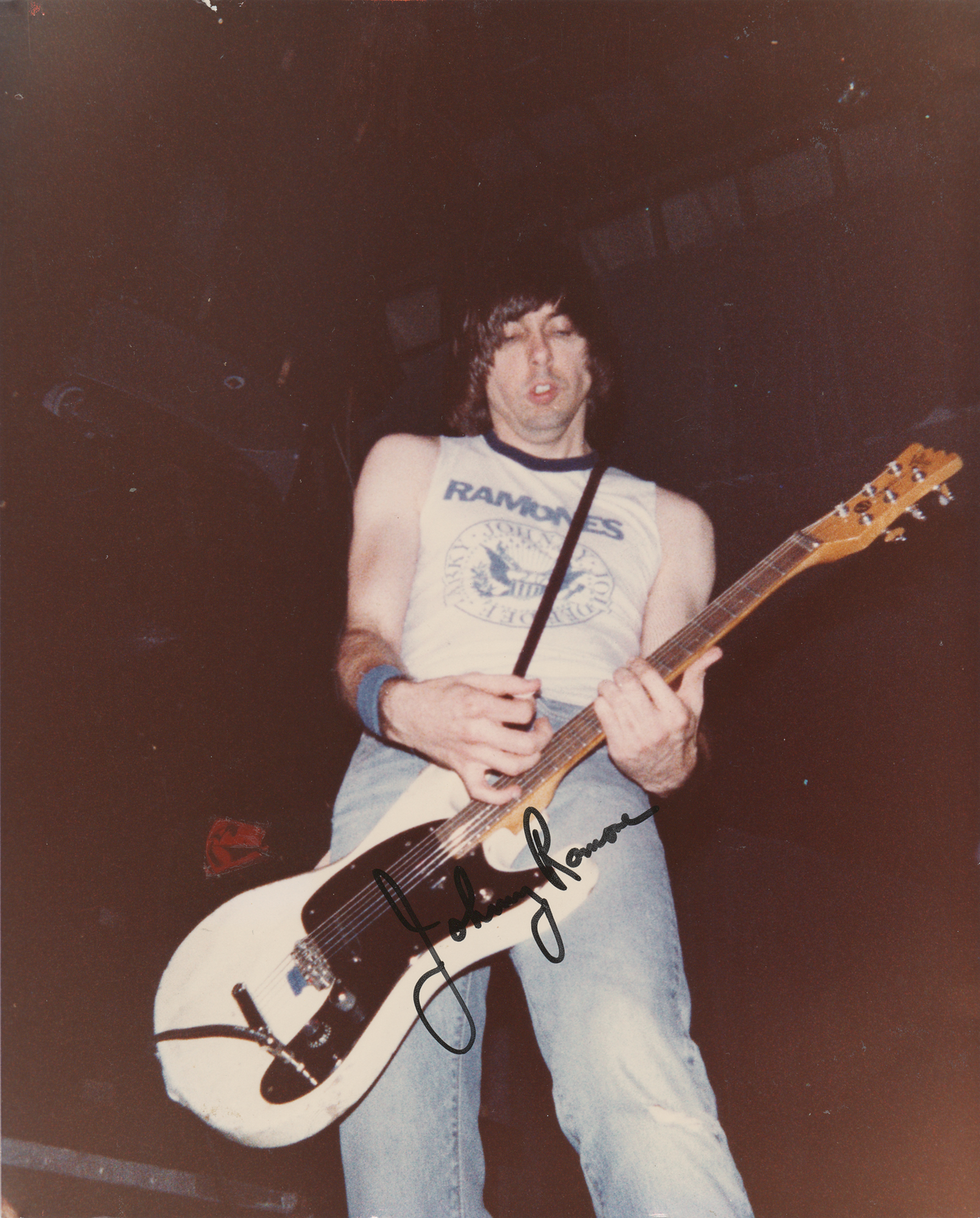 Accompanied by a letter of provenance from avid Ramones collector and fan Robert Martel, who states: "This one-of-a-kind photo was taken on August 28, 1982 when I saw the Ramones at a Hampton, Beach ('Club Casino') show…I was a guest of the band and had been given front row seats for the show. I took the photo that day on a 110mm camera…It was autographed by Johnny at a Strawberries Records in-store signing on October 13th, 1984 in Manchester, NH, hosted by my personal friend, former bandmate, and renowned Ramones expert Chris Lamy."