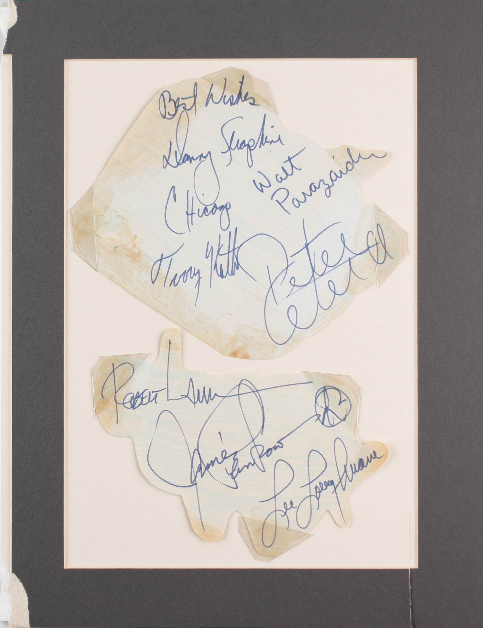 Rare bold vintage felt tip signatures of all seven original Chicago members—Terry Kath, Danny Seraphine, Peter Cetera, Walt Parazaider, Robert Lamm, James Pankow, and Lee Loughnane—on two irregularly trimmed sheets with a light blue woodgrain pattern. Matted to an overall size of 10.25 x 13.75. In very good condition, with staining to the edges.
