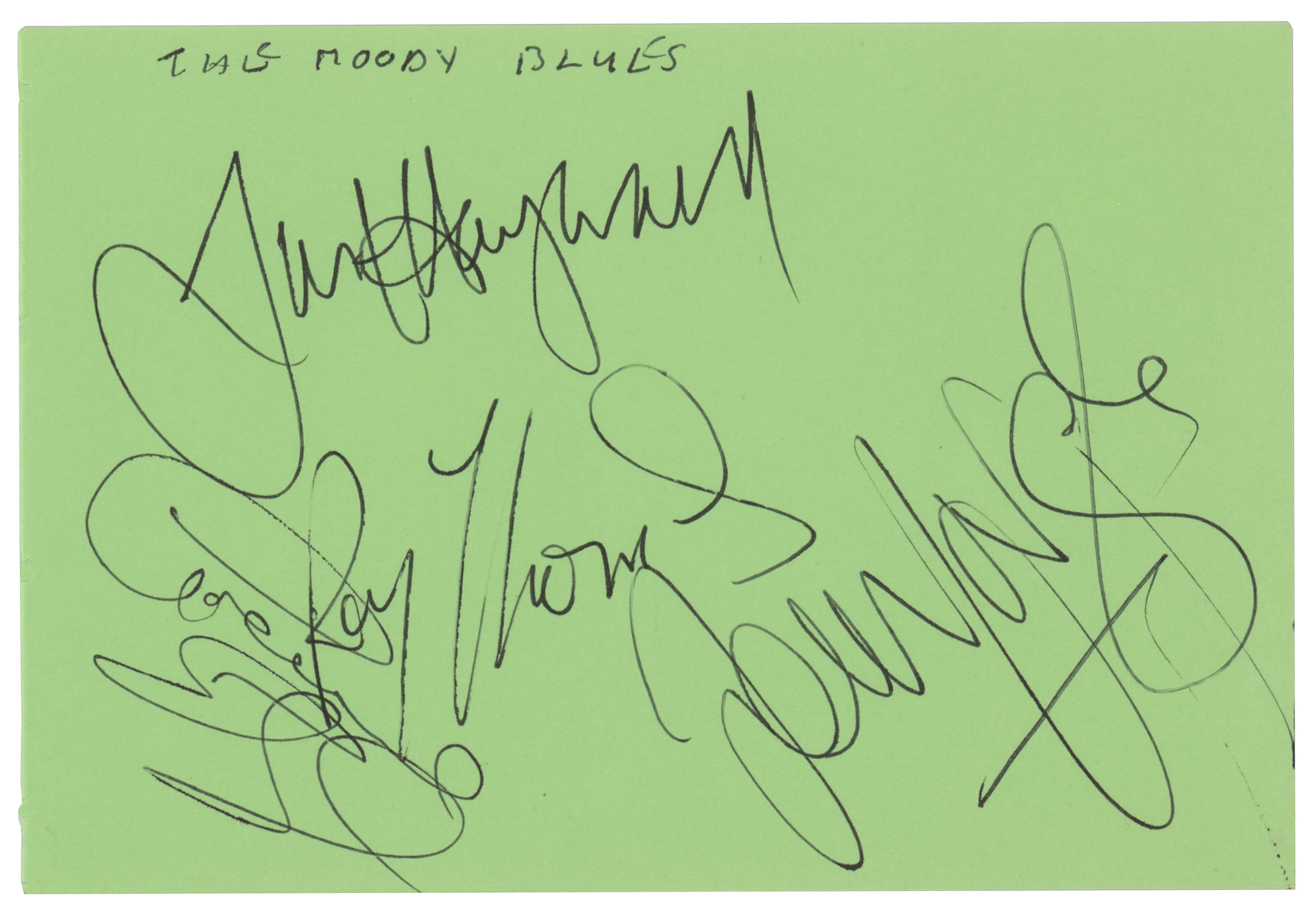 Vintage circa 1960s ink signatures of Graeme Edge, John Lodge, Justin Hayward, and Ray Thomas on a green 5 x 3.5 album page, with identification notation penned at the top. In fine condition.