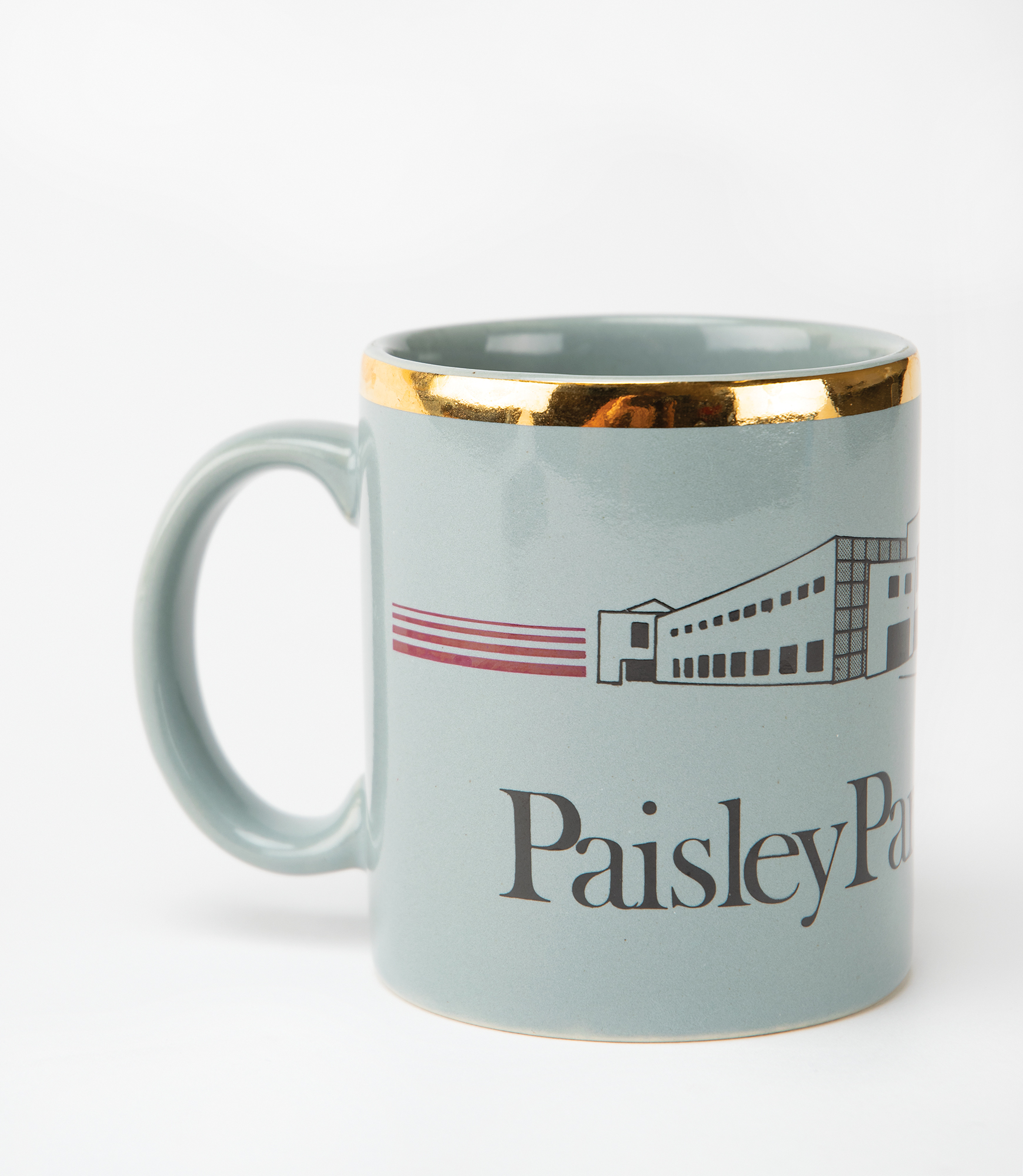 Prince's personally-used gray coffee mug featuring a large "Paisley Park Studios" logo and gilt rim. Prince had a set of six of these in his office kitchen—this is the only one to survive. From the collection of Prince's assistant Therese Stoulil, who notes that she made Prince many cups of Earl Grey tea—with three heaping tablespoons of honey—in this mug. In fine condition. Accompanied by a letter of provenance from Stoulil.