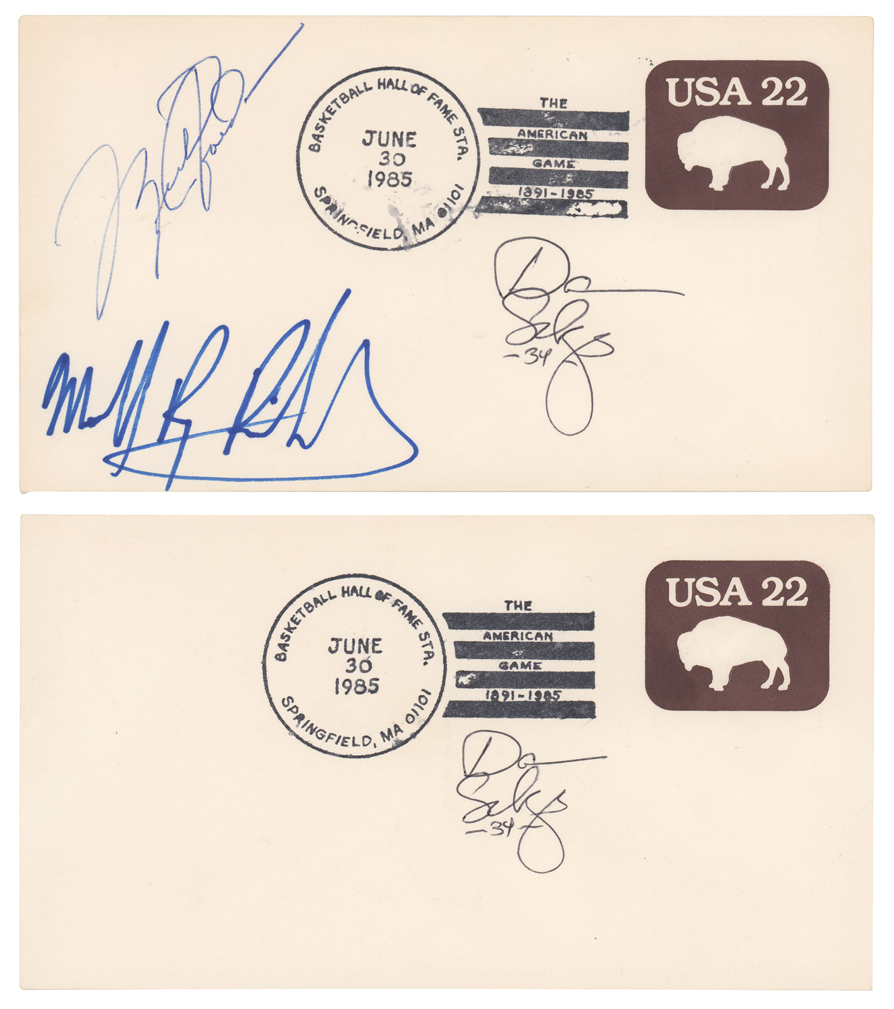 Postal cover postmarked at the Naismith Memorial Basketball Hall of Fame on June 30, 1985, signed in blue ballpoint by Michael Jordan, in black ballpoint by Danny Schayes, and in blue felt tip by Micheal Ray Richardson. In fine condition. Accompanied by a cover signed by just Schayes. A choice exemplar of Jordan's rookie-era signature.