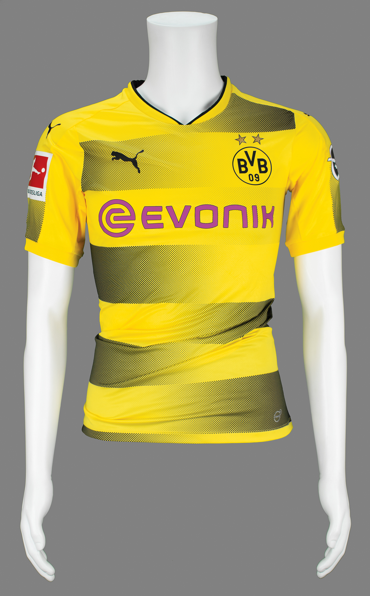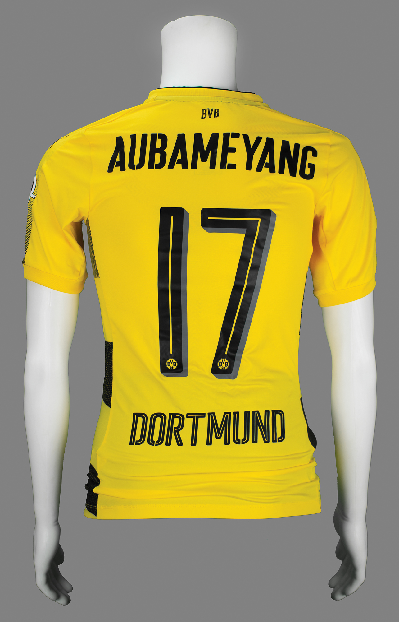 Official Borussia Dortmund home jersey worn by striker Pierre-Emerick Aubameyang during a match in the 2016-2017 season. The Puma powerCELL jersey, size medium, features sponsors and club logo to front, patches to shoulders, and name “Aubameyang” and number “17” to back. In fine condition, with expected wear from use. Accompanied by a certificate of authenticity from Alexandre Silva da Silveira, a coordinator for the Brazilian National Soccer Team, who affirms that the jersey derives from his personal collection.