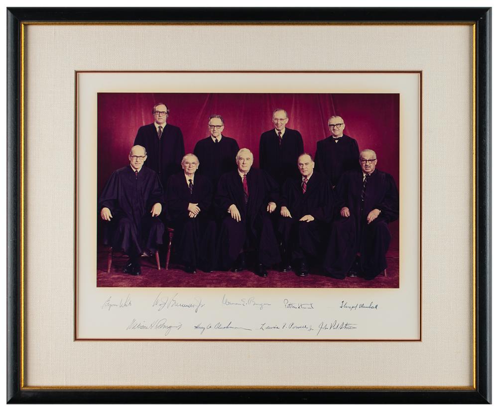 Color matte-finish 14 x 9 formal official portrait of the Burger Court, signed on the mount in ink by all pictured: Byron R. White, William H. Rehnquist, William J. Brennan, Jr., Harry A. Blackmun, Warren E. Burger, Lewis F. Powell, Jr., Potter Stewart, John Paul Stevens, and Thurgood Marshall. Cloth-matted and framed to an overall size of 22.5 x 18.5. In fine condition, with faint toning around the perimeter of the image. Consignor notes that the photo was obtained from one of Justice Marshall's clerks.