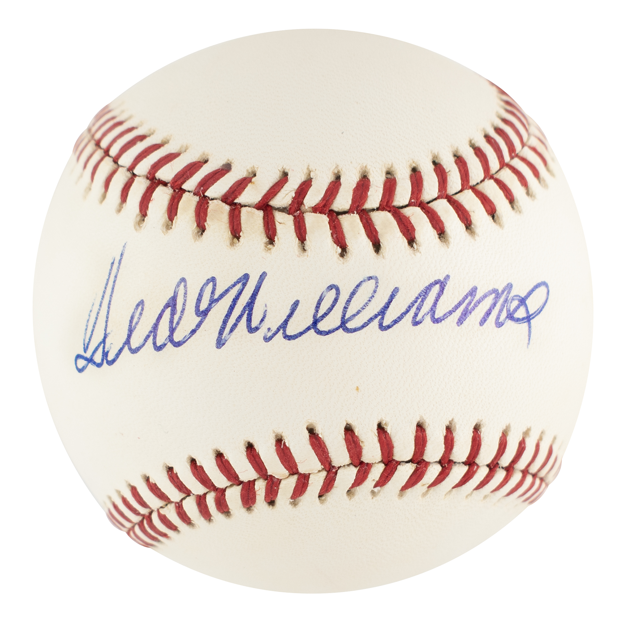 Official Rawlings American League (Brown) baseball signed in blue ballpoint on the sweet spot, "Ted Williams." In fine to very fine condition, with a trivial light stain to the right side panel.