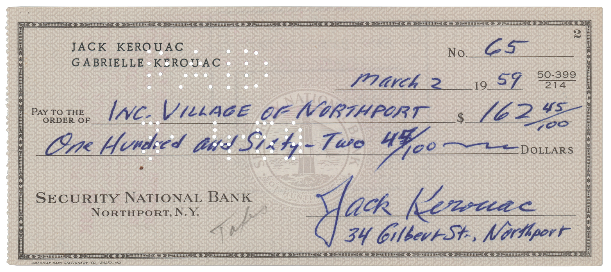 Personal check, 6.25 x 2.75, filled out and signed by Kerouac, "Jack Kerouac, 34 Gilbert St., Northport," payable to Inc. Village of Northport for $162.45, March 2, 1959. In fine condition. Kerouac and his mother, Gabreille, lived in Northport, New York, between 1958 and 1964.